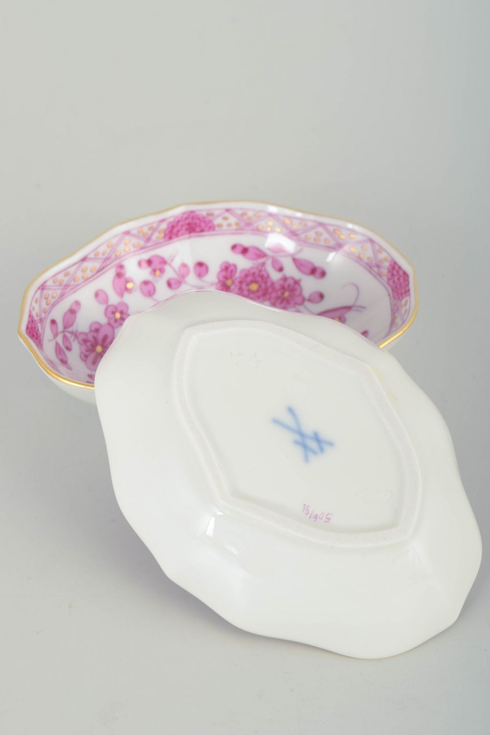 Meissen, grundlagt i 1710 som Europas første porcelænsfabrik, er kendt for sine ikoniske mønstre og høje håndværksmæssige kvalitet. "Indian"-dekorationen blev introduceret i 1740’erne, inspireret af asiatisk porcelæn, og blev hurtigt en af manufakturens mest populære serier. "Pink Indian" variationen er blandt de mest elegante og eftertragtede, og små dele som disse skåle udgør et smukt supplement til et komplet servicesæt.