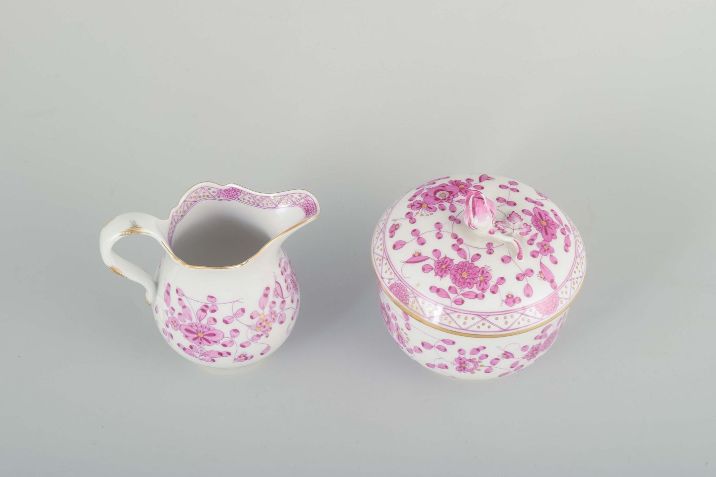 Porcelænssæt bestående af sukkerskål med låg og flødekande, håndmalet i det klassiske mønster "Pink Indian", dekoreret med rosa blomster og blade samt guldbemaling på kanter, knop og hanke.