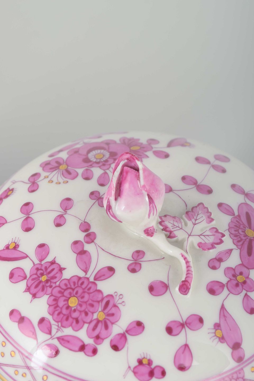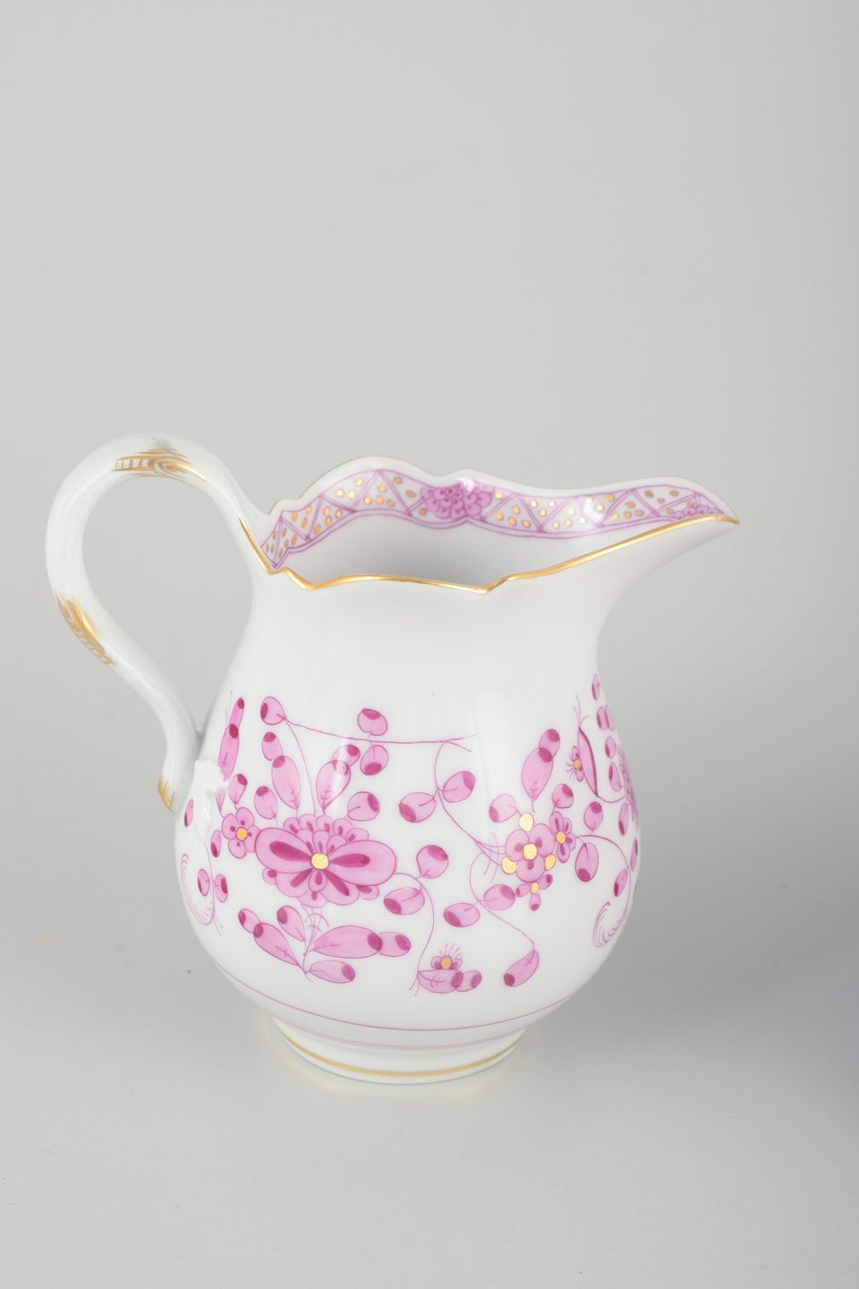 Meissen, grundlagt i 1710 som Europas første porcelænsfabrik, er berømt for sine håndmalede mønstre og udsøgte kvalitet. "Indian" mønsteret blev introduceret i 1740’erne, inspireret af asiatisk porcelæn, og er et af manufakturens mest populære designs. Den rosa variation, "Pink Indian", er blandt de mest elegante og eftertragtede og forbliver et højt værdsat samlerobjekt.