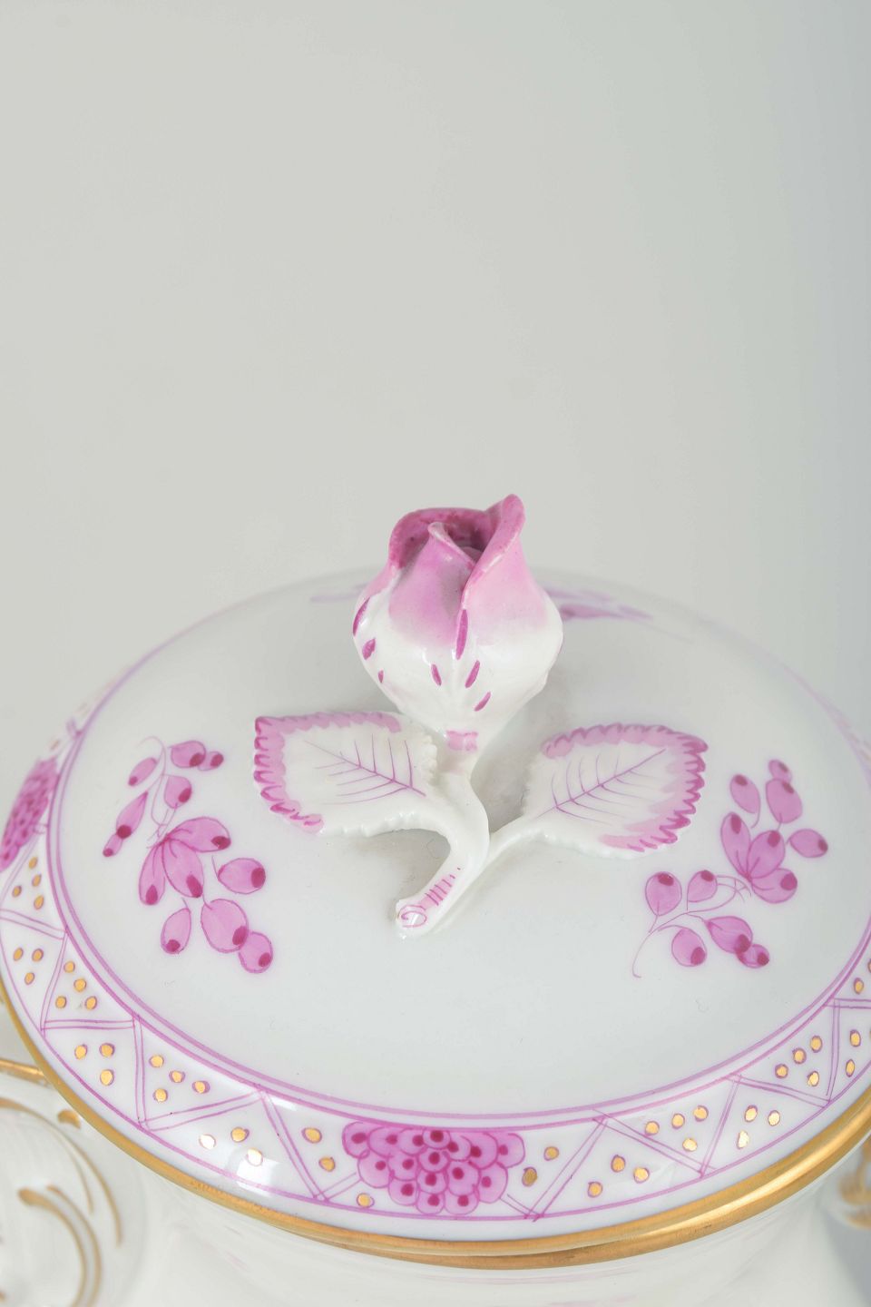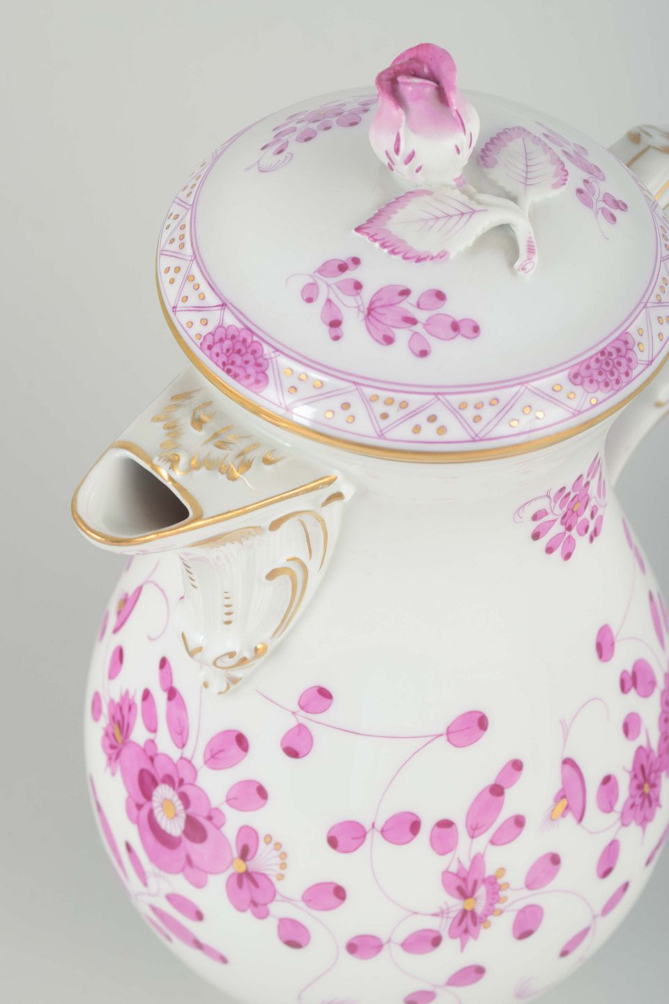 Porcelæns kaffekande med låg, håndmalet i det klassiske mønster "Pink Indian", dekoreret med rosa blomster og blade samt guldbemaling på kant, tud og hank.