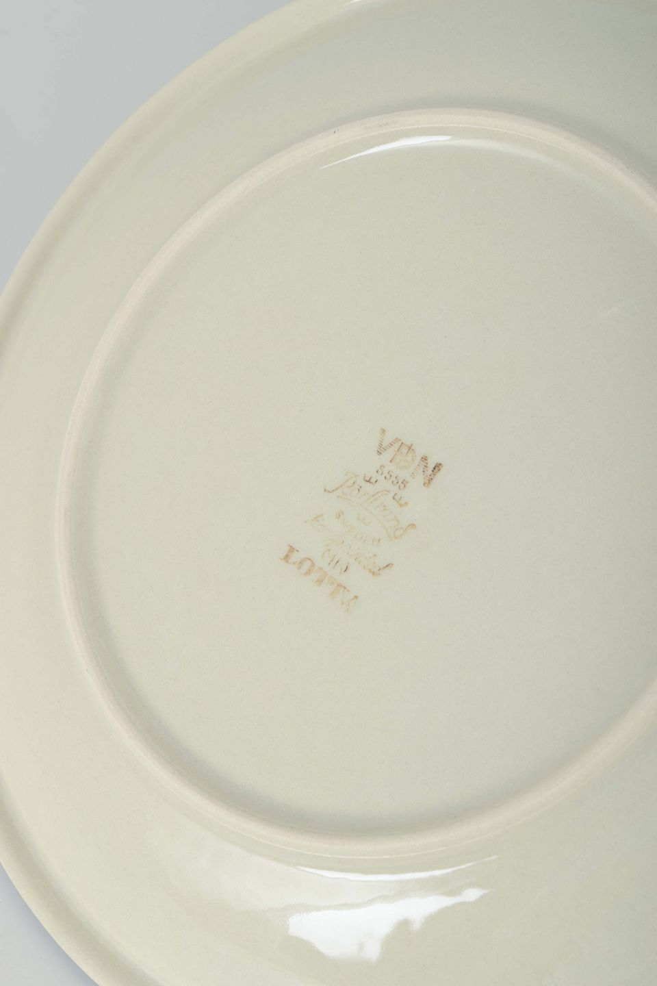 Sæt af otte tallerkener i fajance med hvid glasur, grøn og blå dekoration.
