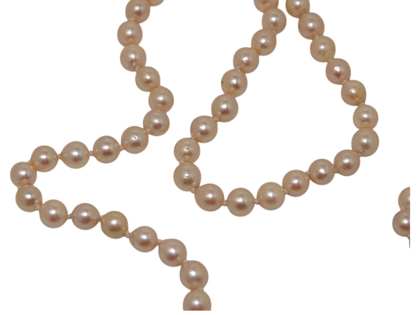 Lang perlekæde af store creme-farvet Akoya perler fra Japan. Akoya perler er regnet af nogle af de bedste perler blandt andet på grund af en general højere kvalitet, en rundere form og en flot skinnende overflade.