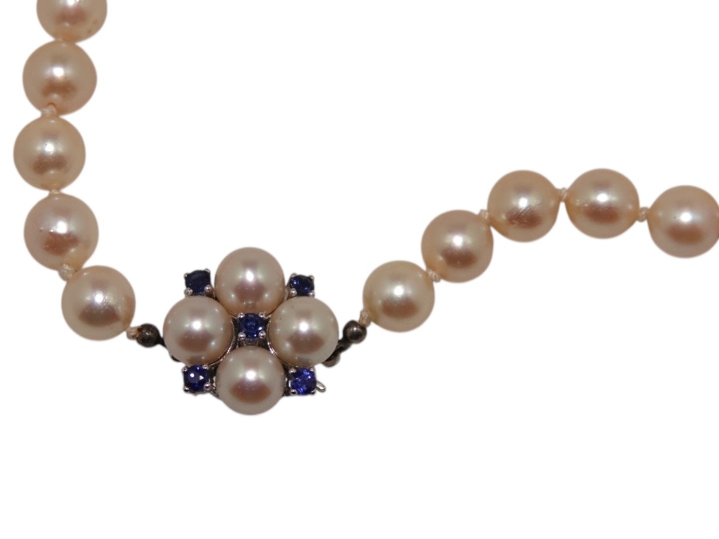 Lang perlekæde af store japanske Akoja perler med 14 karat hvidgulds vedhæng med blå safirer