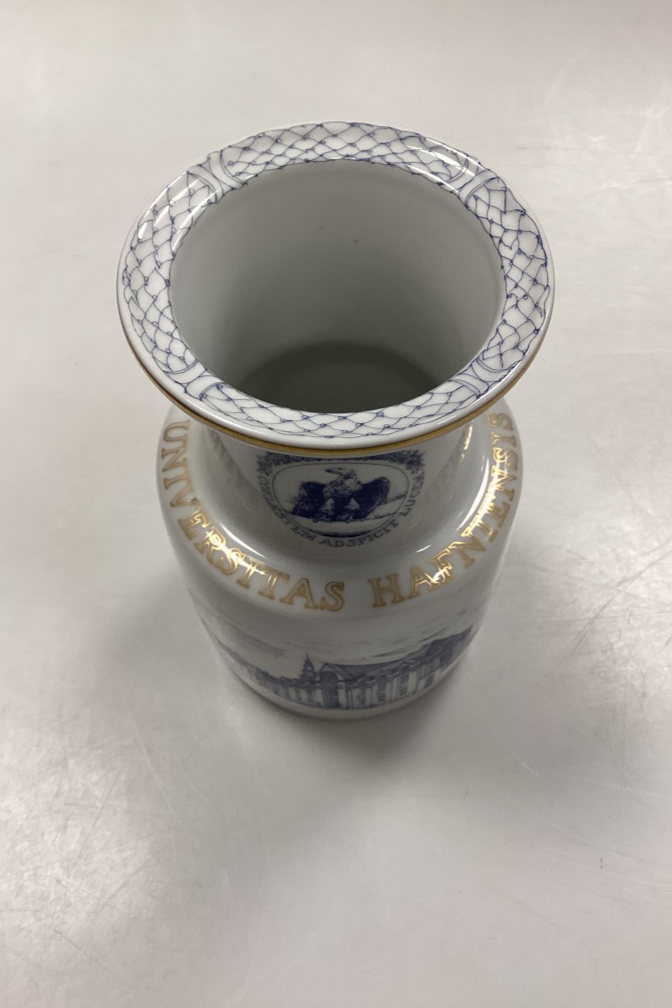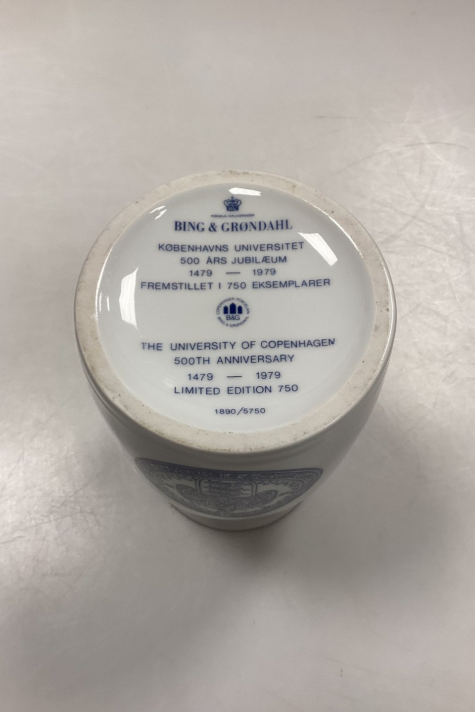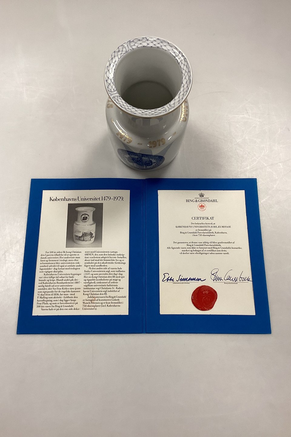 Bing og Grøndahl Vase No. 1890/5750 - Københavns Universitet 500 års Jubilæum. Fremstillet i 750 eksemplarer. Indskrift: Universitas Hafniensis - 1479 - 1979. Certifikat medfølger.