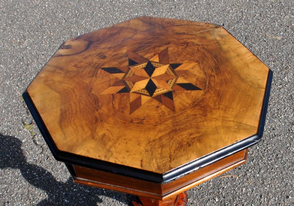 8-seitiger Nähtisch aus Walnussholz mit Intarsien, 19. Jahrhundert. Dänemark.
