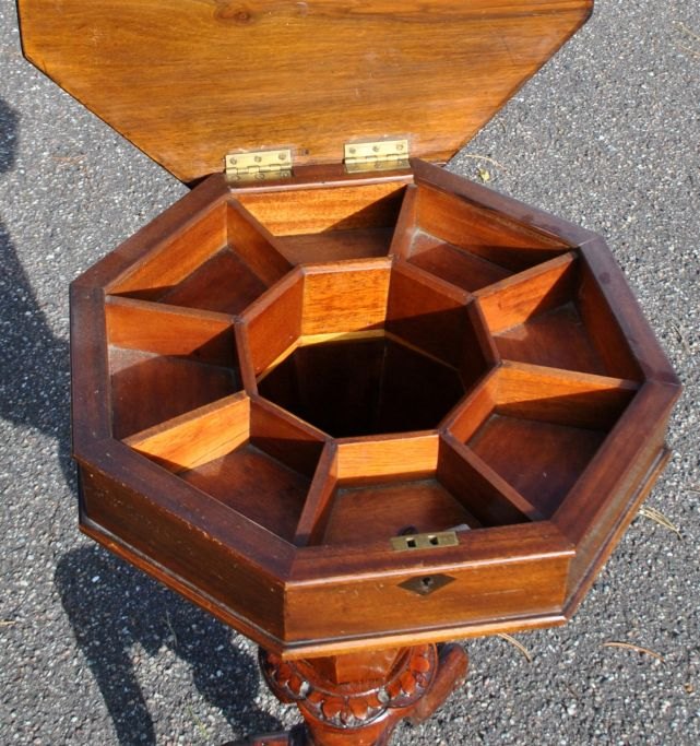 8-seitiger Nähtisch aus Walnussholz mit Intarsien, 19. Jahrhundert. Dänemark. Auf geschnitztem Dreibein. 8-seitige Säule zur Garnaufbewahrung. 8-seitige Platte mit Tischplatte. Innen mit 8 Fächern. Mit Schlüssel und Schloss. Platte mit Intarsien in Sternmuster verziert. Poliert. H.: 72 cm. Durchmesser Platte: 42 cm.