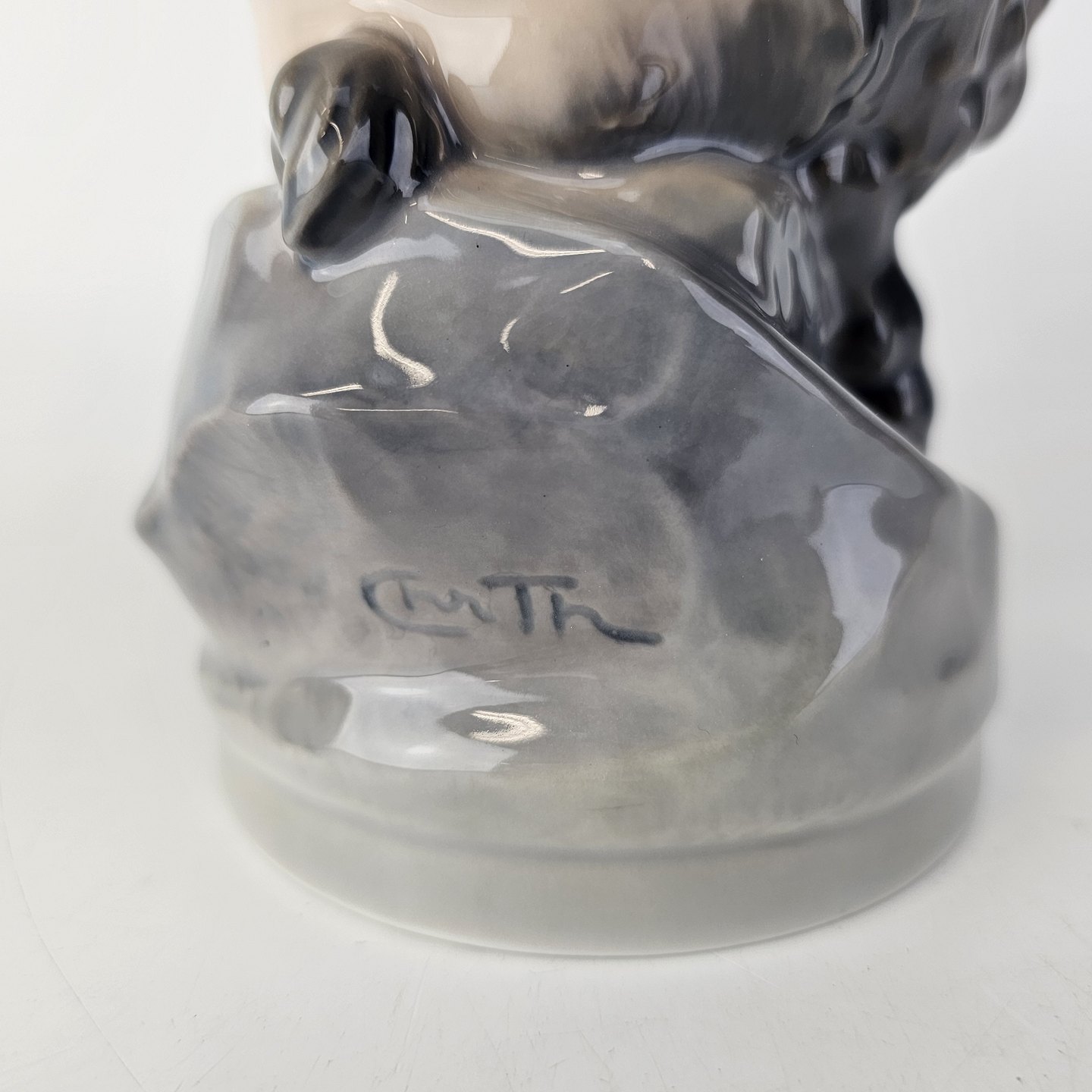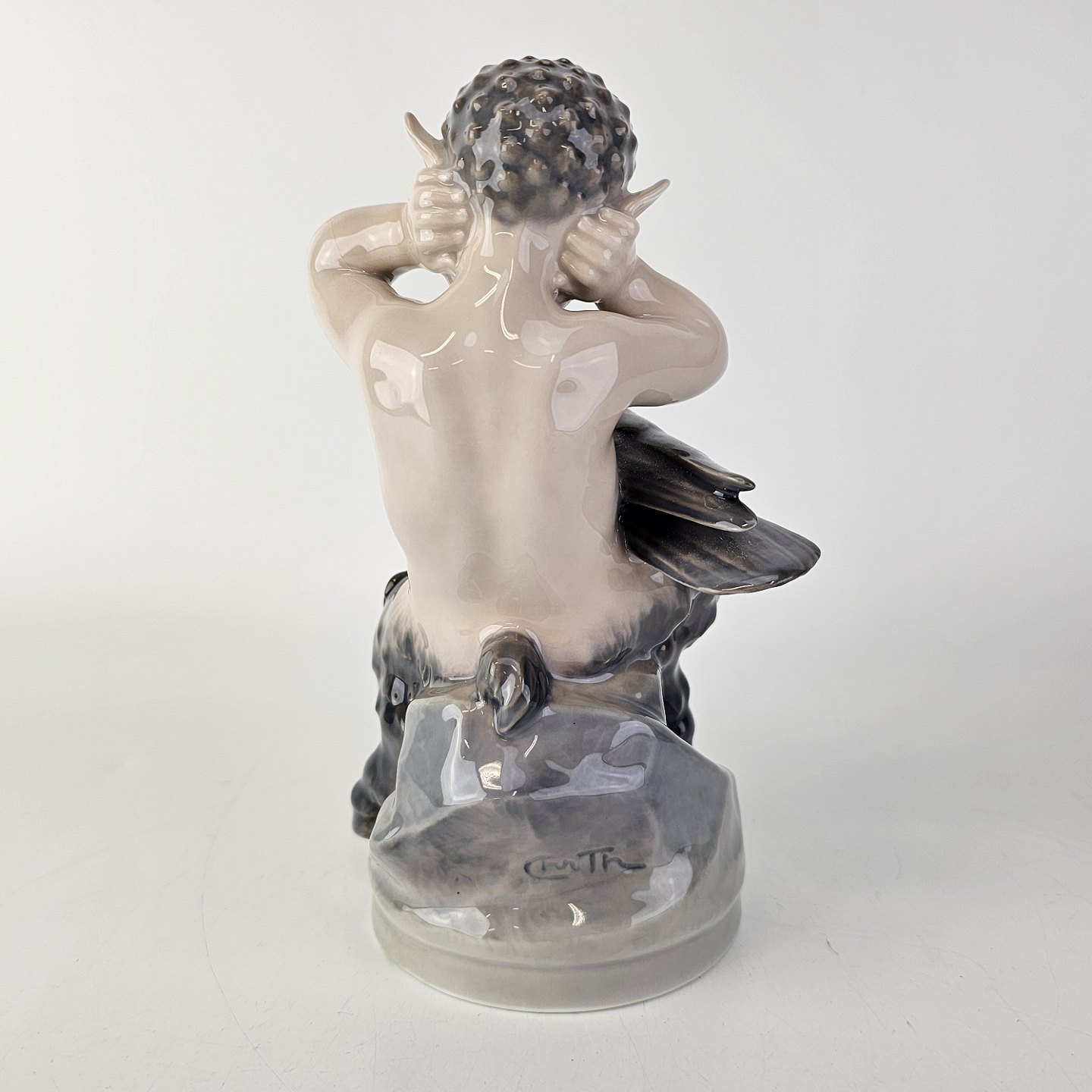 Text zugänglich auf Dänische: Figur af porcelæn med motiv af en faun som holder sig for ørerne med en krage i skødet