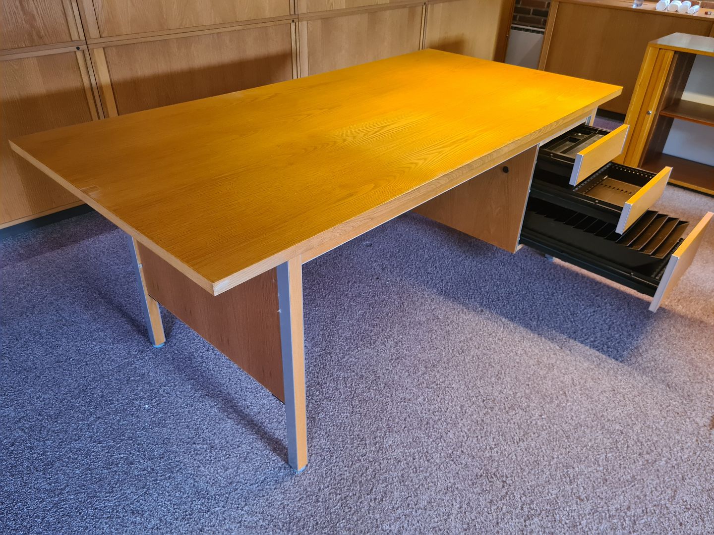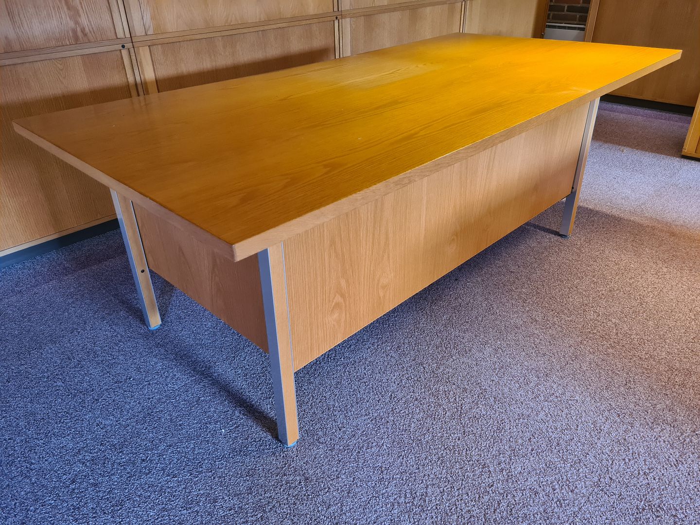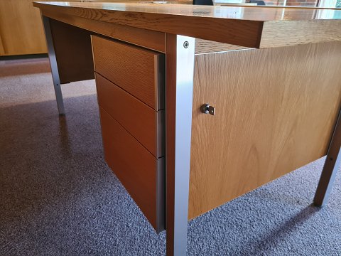 Text zugänglich auf Dänische: Stort Skrivebord fra 1980'erne i eg og aluminium. Fremstår pænt, velholdt og udmærket funktionsdygtigt. Dog med meget let afblegning på bordpladen efter en skrivemåtte. (Ses på billede)