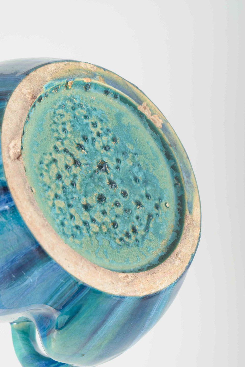 Organisk formet vase i stentøj med skulpturelle detaljer og flerfarvet glasur i blå og grønne nuancer. Typisk for Art Nouveau-periodens naturinspirerede formsprog.