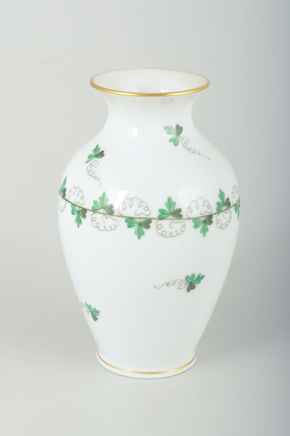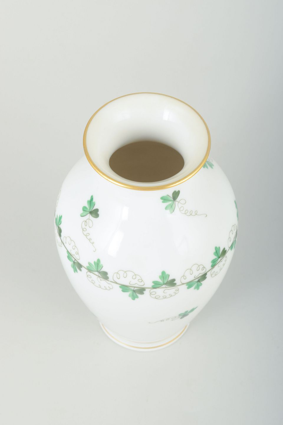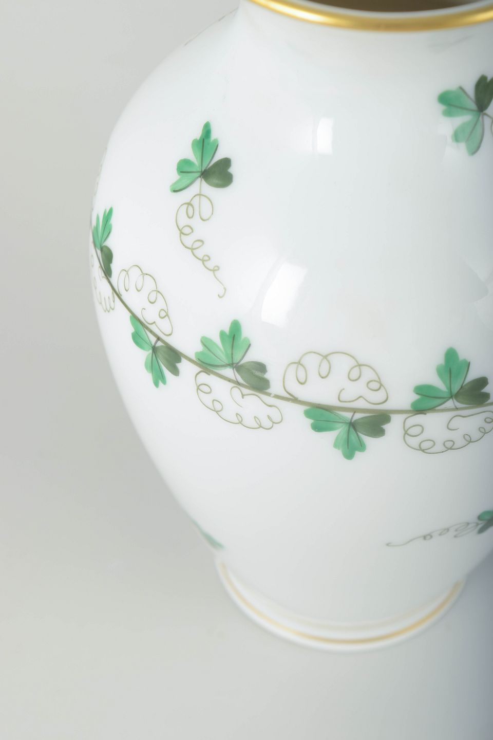 Elegant porcelænsvase med håndmalet grønt bladdekor og fine detaljer i guld. Klassisk form med svungen korpus og afrundet fod, afsluttet med guldkant ved åbningen.