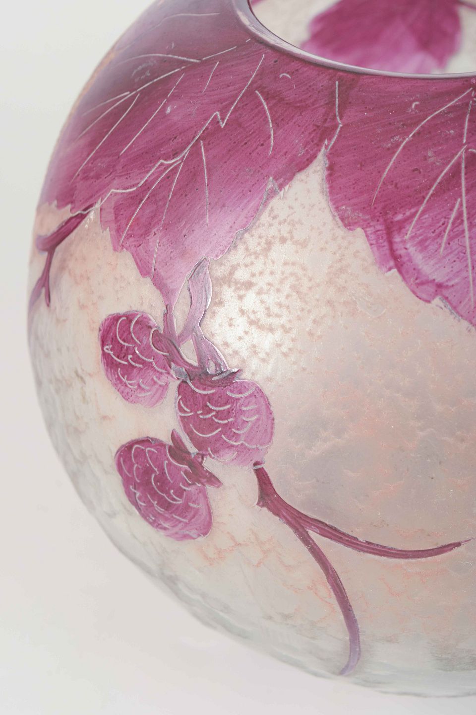 Kugleformet vase i matteret og opaliseret glas med graveret og syreætsede dekorationer af blade og blomster i violette nuancer. Signeret “Légras” i dekoren.