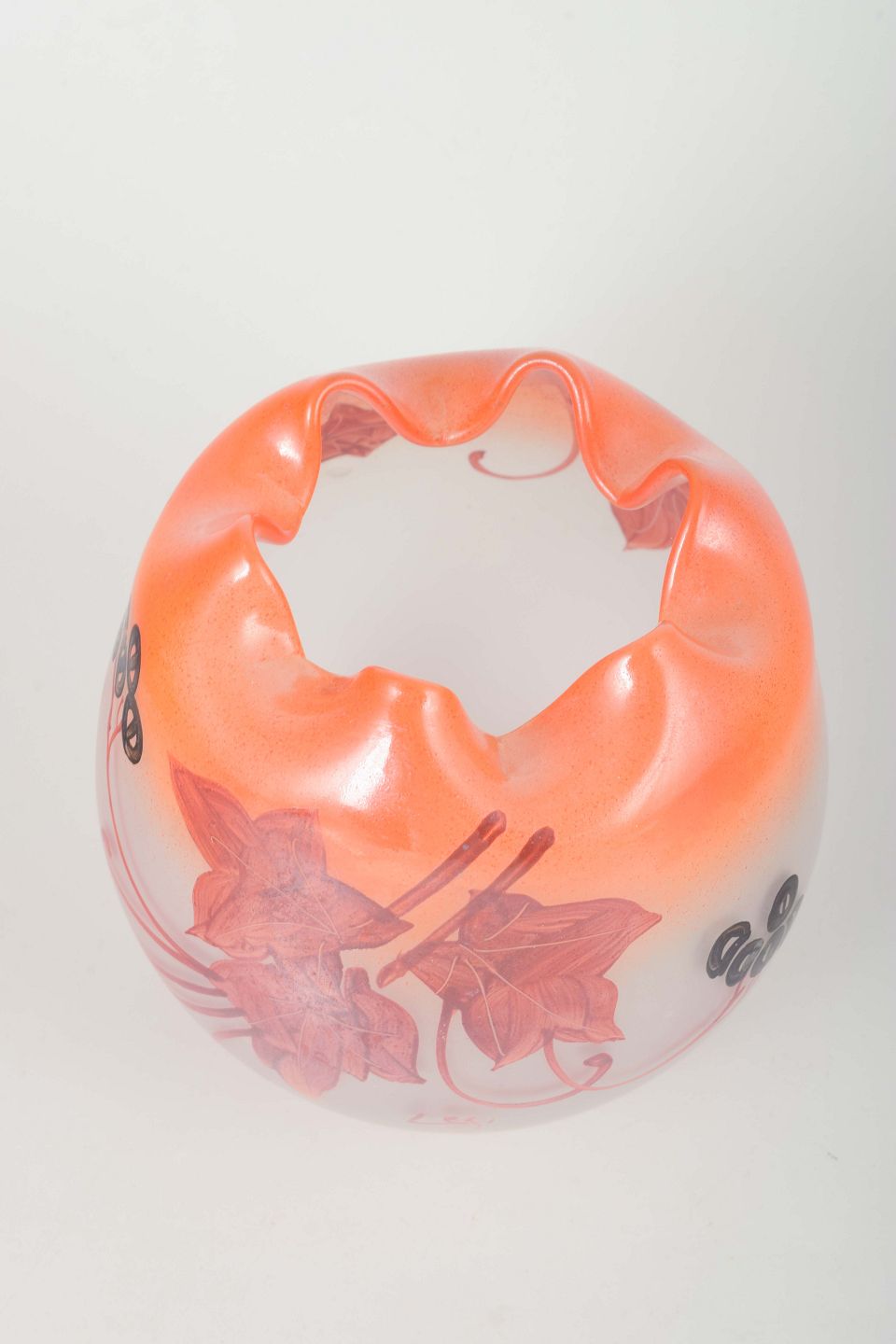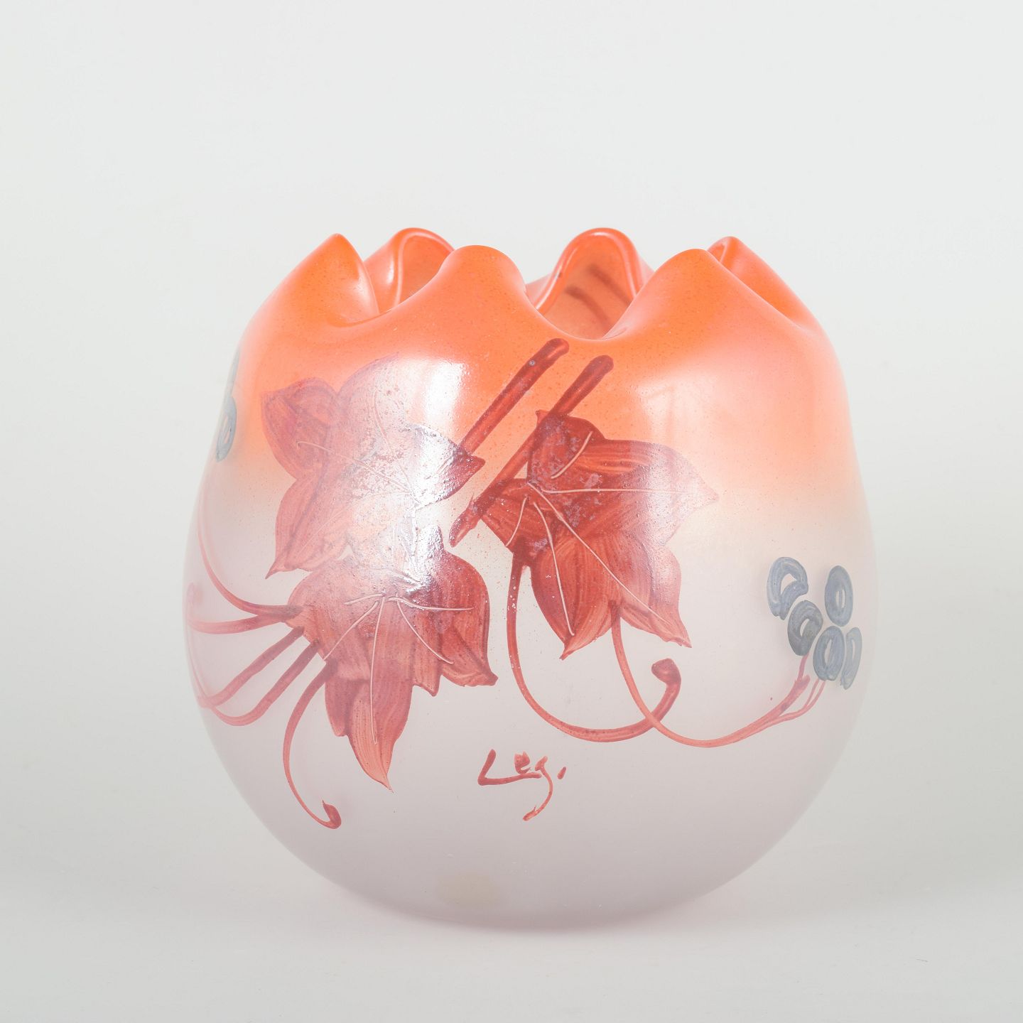 Organisk formet vase i flerfarvet opaliseret glas med håndmalet dekoration af røde vinblade og mørke bær. Den bølgende åbning forstærker vasens dekorative udtryk. Signeret “Légras” i dekoren.