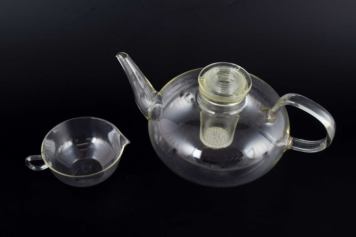Bauhaus-inspireret tekande med integreret tesi samt matchende flødekande. Fremstillet i varmefast borosilikatglas (Jenaer Glas).