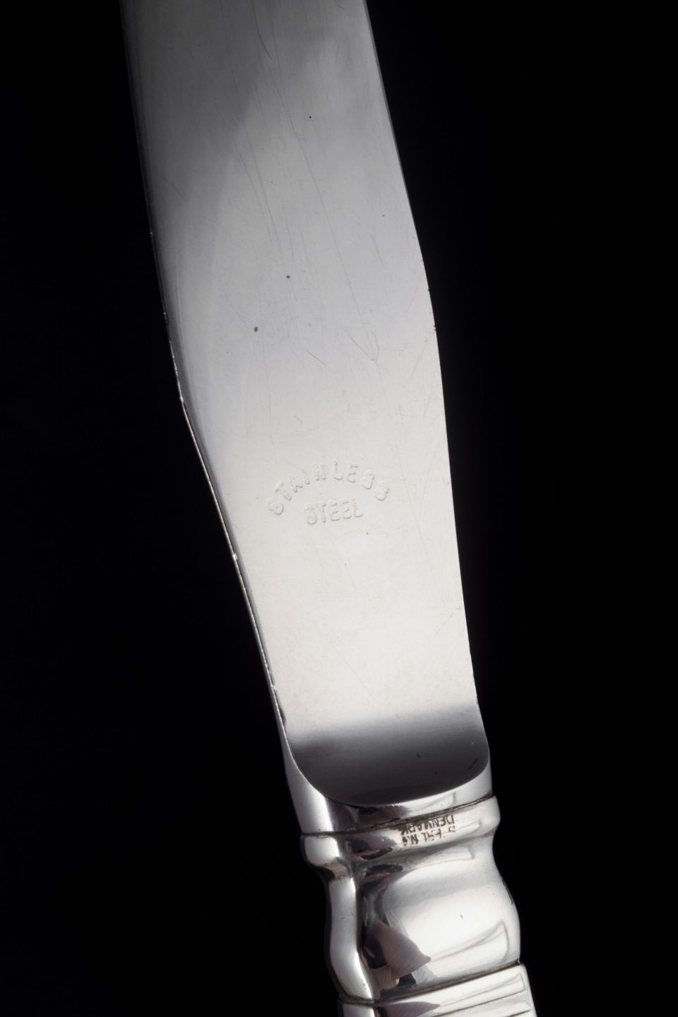 Sæt bestående af 4 middagsknive i det elegante “Blok / Acadia”-mønster, designet af Harald Nielsen i 1918. Knivene har sterlingsølvskafter kombineret med lange klinger i rustfrit stål. Designet er et klassisk eksempel på Art Deco-stilen med funktionalistiske linjer og geometriske proportioner.