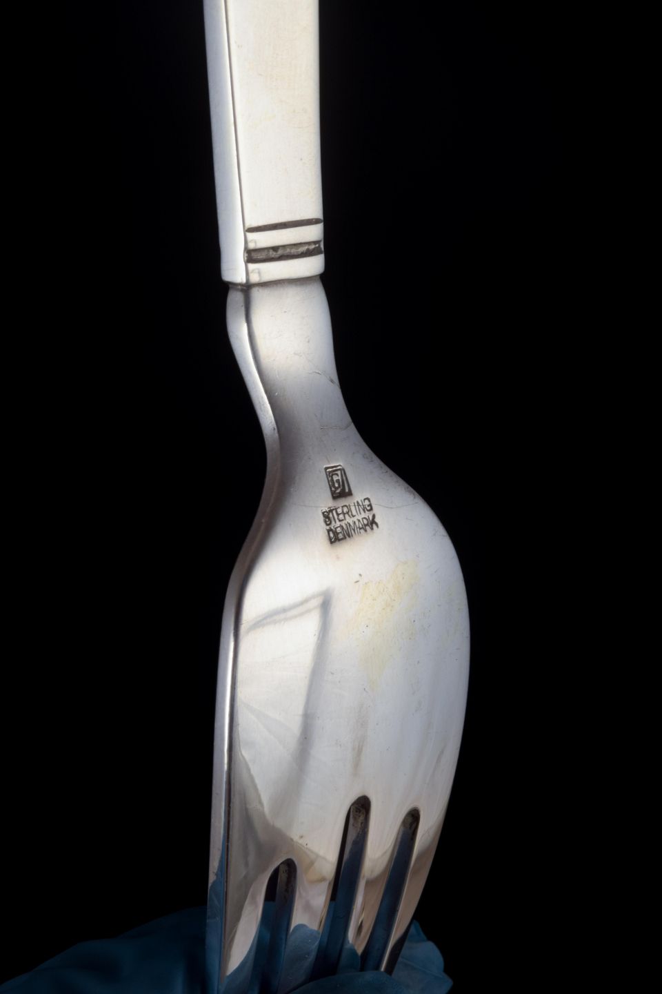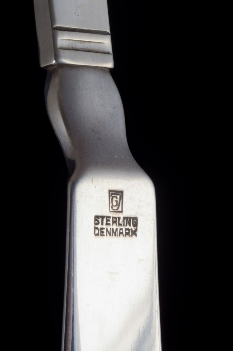 Sæt bestående af 8 dele fiskebestik til 4 personer i det elegante “Blok / Acadia”-mønster, designet af Harald Nielsen i 1918. Hver kuvert består af en fiskekniv og en fiskegaffel. Mønstret er karakteriseret ved en stram, funktionalistisk formgivning med glatte flader og geometriske proportioner.