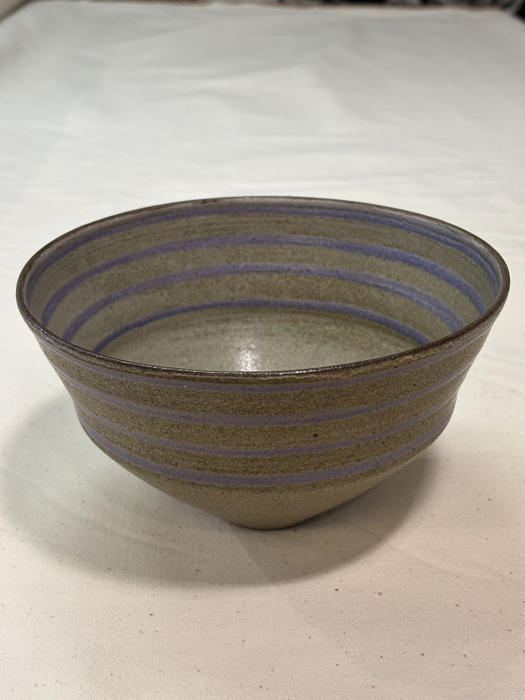 Clara Andersen stentøjs skål med glasur i grågrøn og lilla. Mål b 17 h 11. signeret CA.