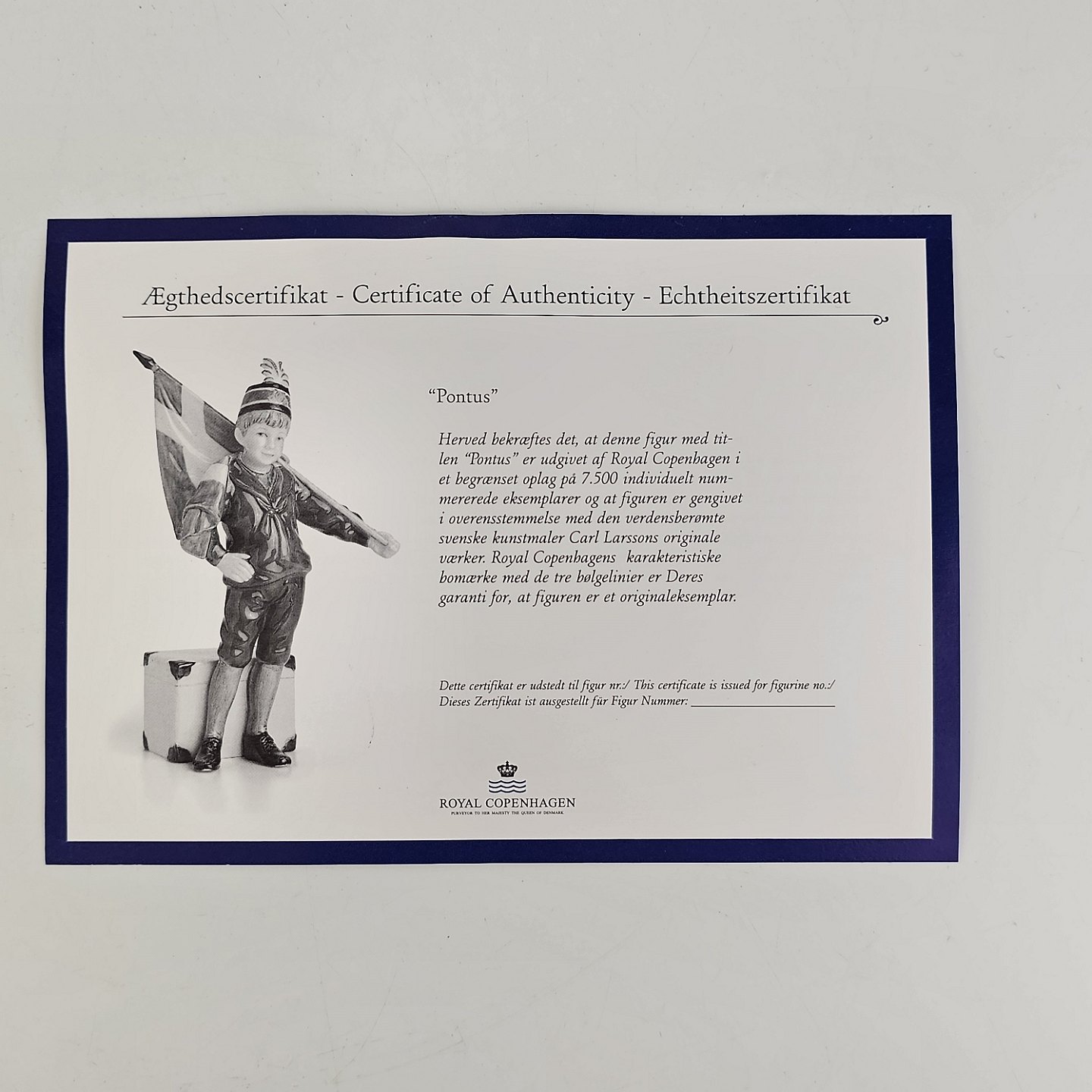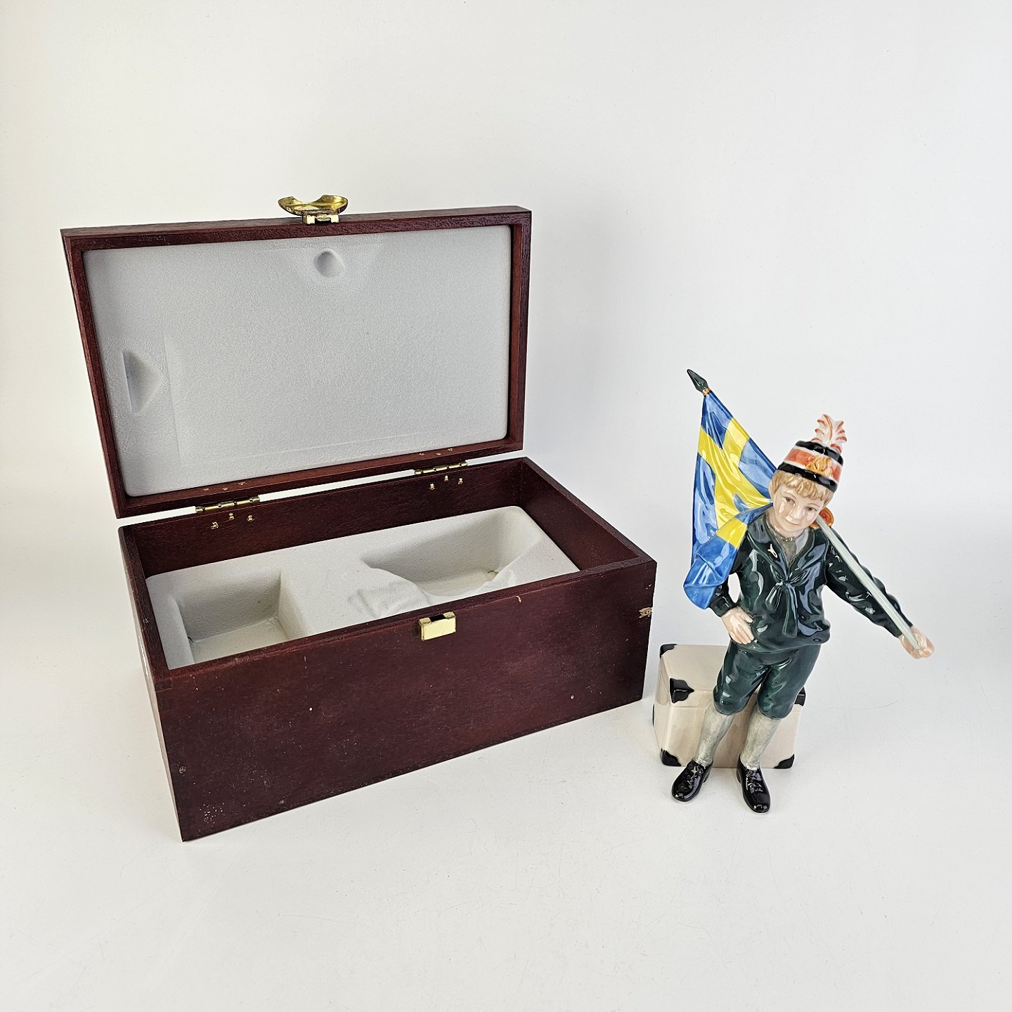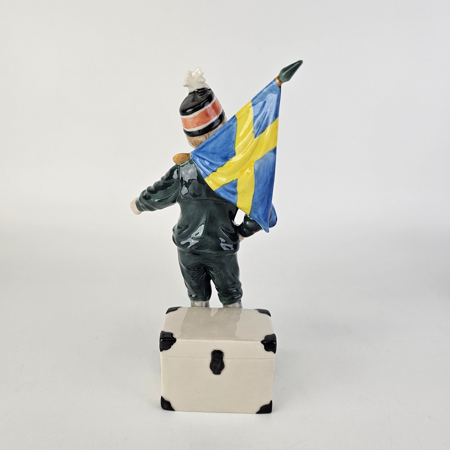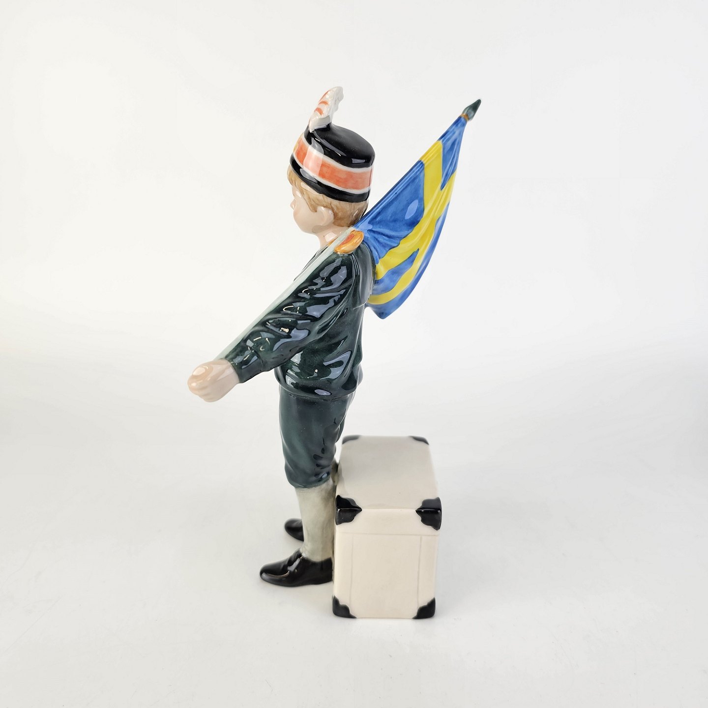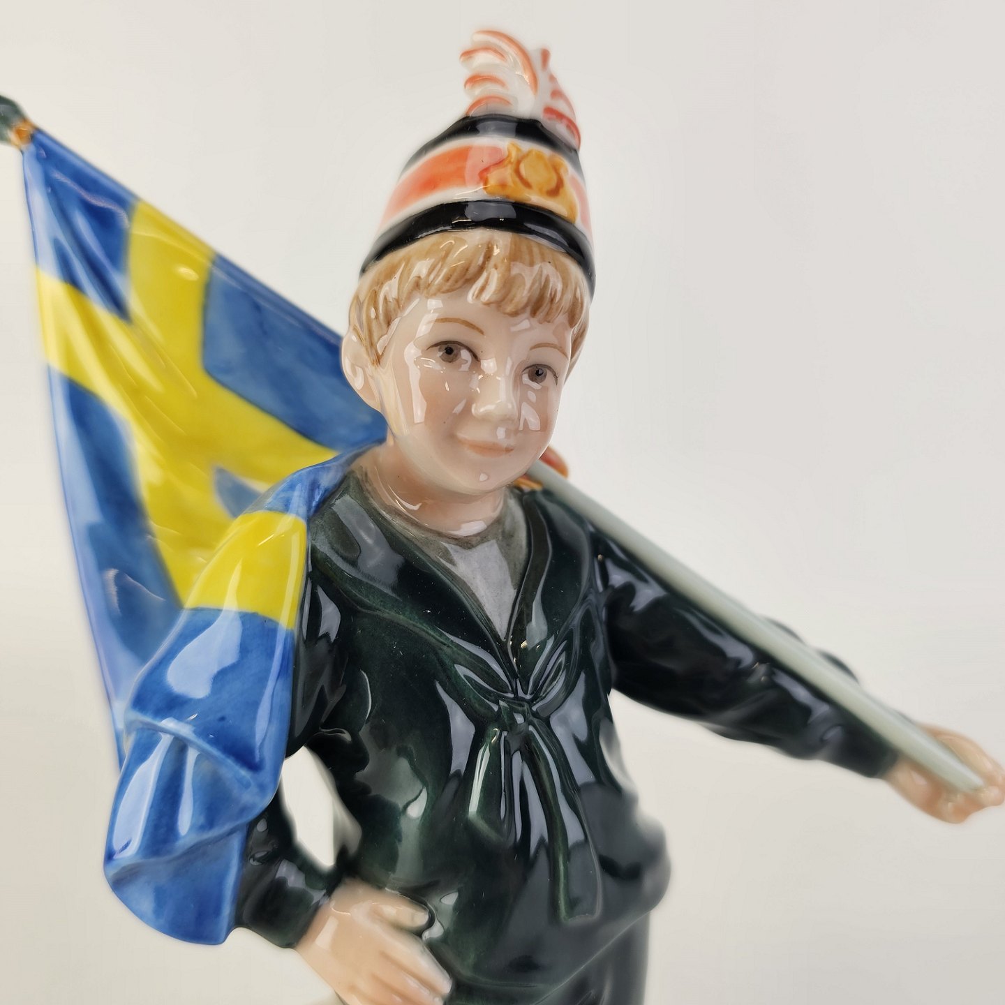 Pontus figur af porcelæn med motiv af en dreng med et svensk flag