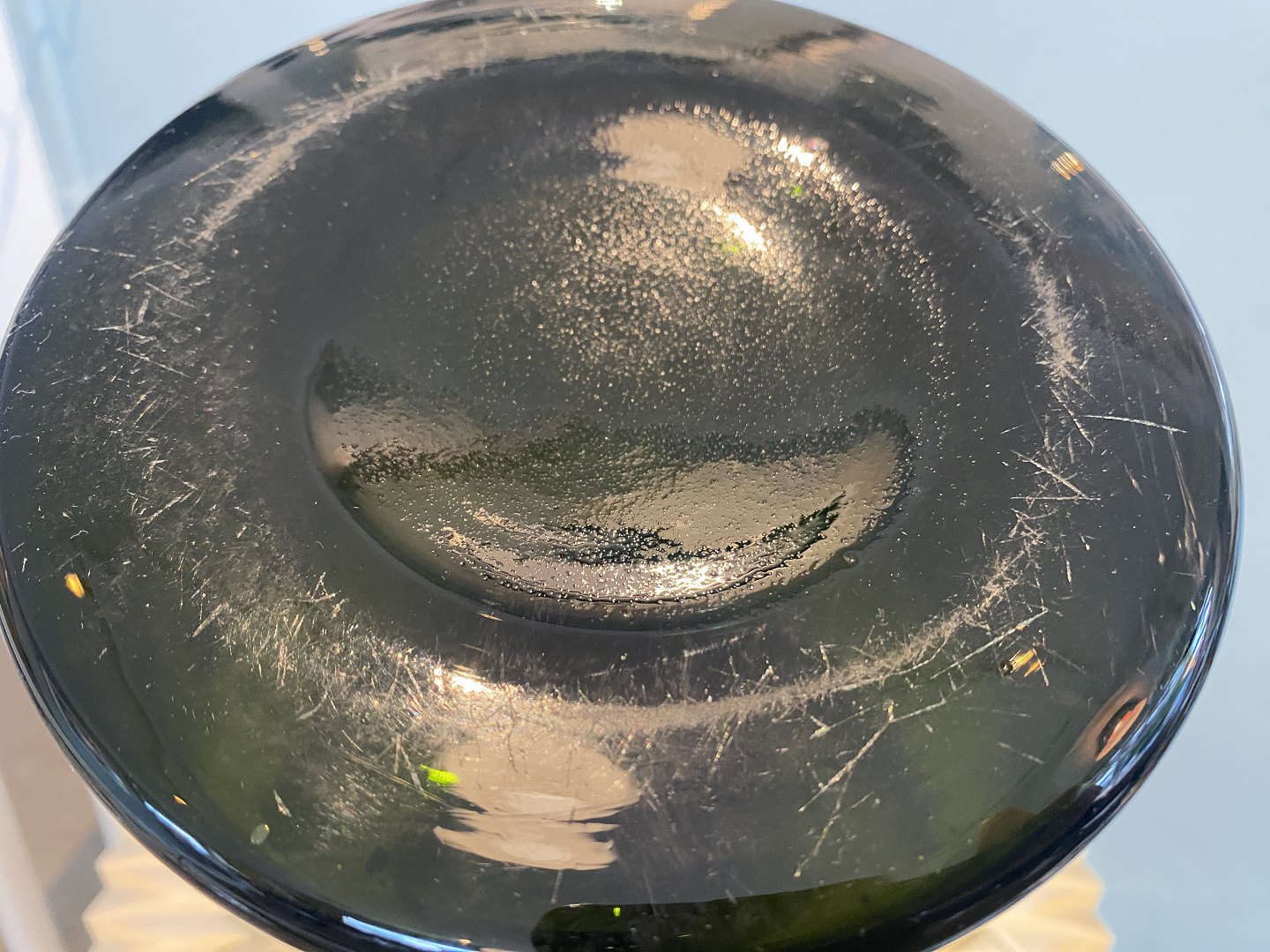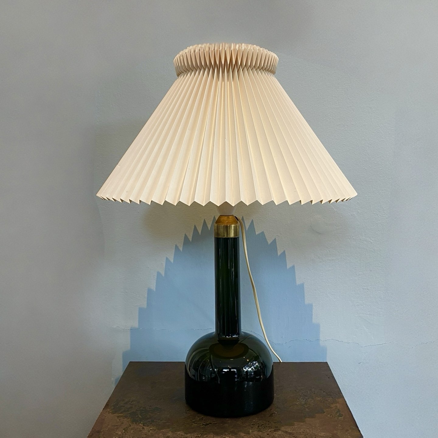 Text zugänglich auf Dänische: Sjælden Le Klint bordlampe med lampefod af mørk grønt glas monteret med plisseret skærm.
