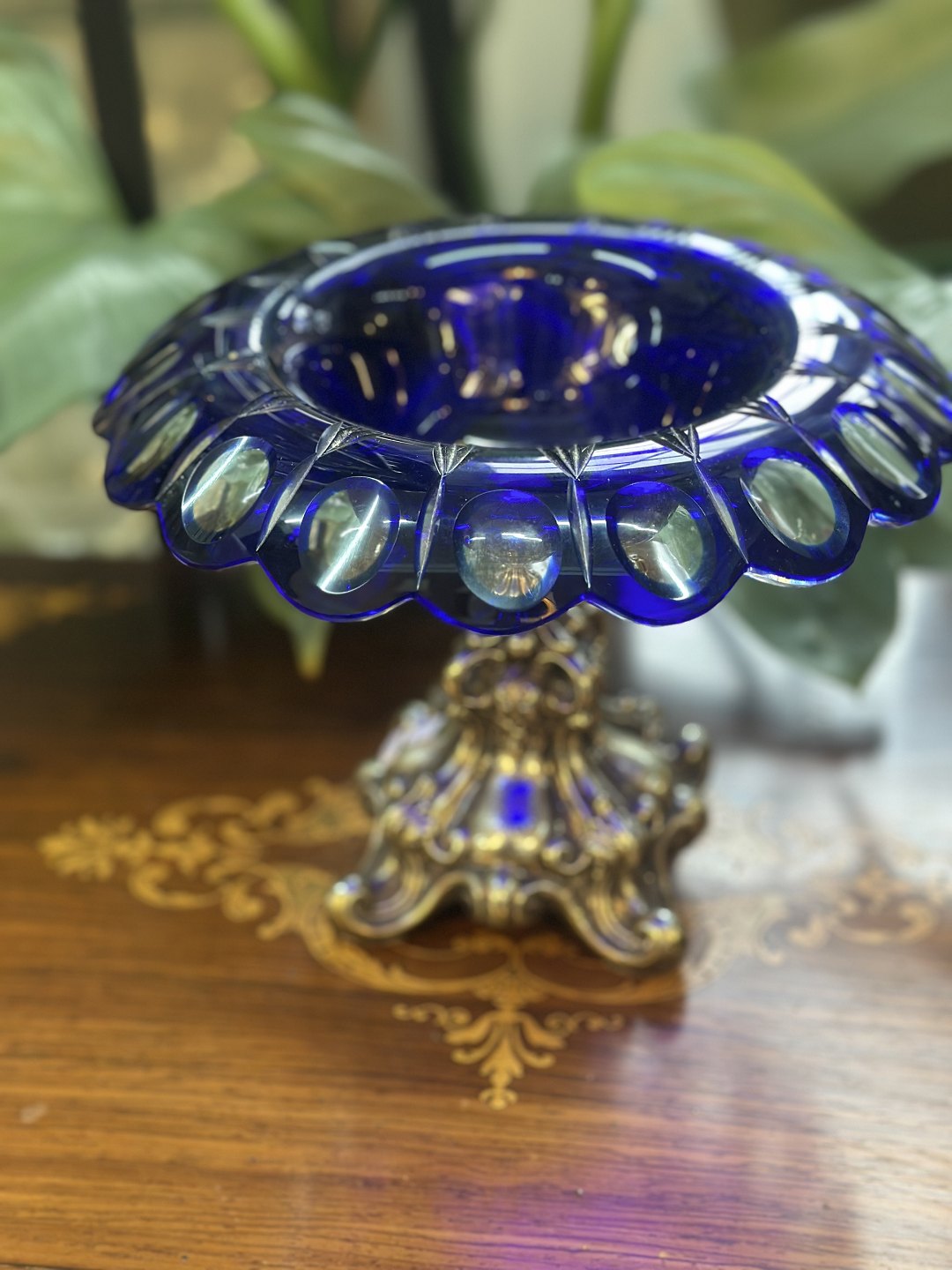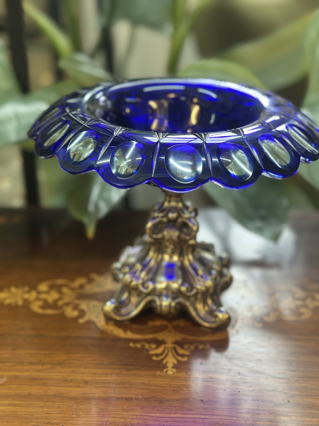 Böhmen Runde Schale mit gewelltem Rand und großer Öffnung auf einem verzierten Metallsockel im Barockstil. Versilbert mit verzierten Akanthusblättern und geschwungenen Füßen