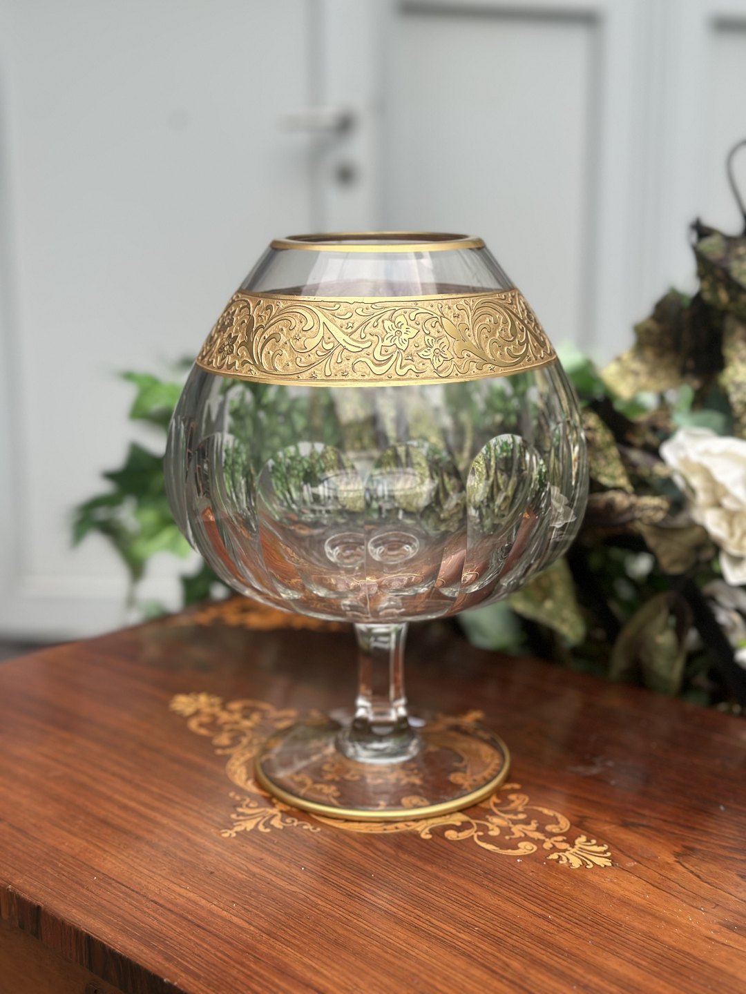 Moser Glaskelch Kristall, sehr hochwertig aus der Mitte des 20. Jahrhunderts, breites Band aus vergoldetem 24 Karat Goldemail mit eingravierten Blumen im klassischen Barock H 18 cm B 10 cm