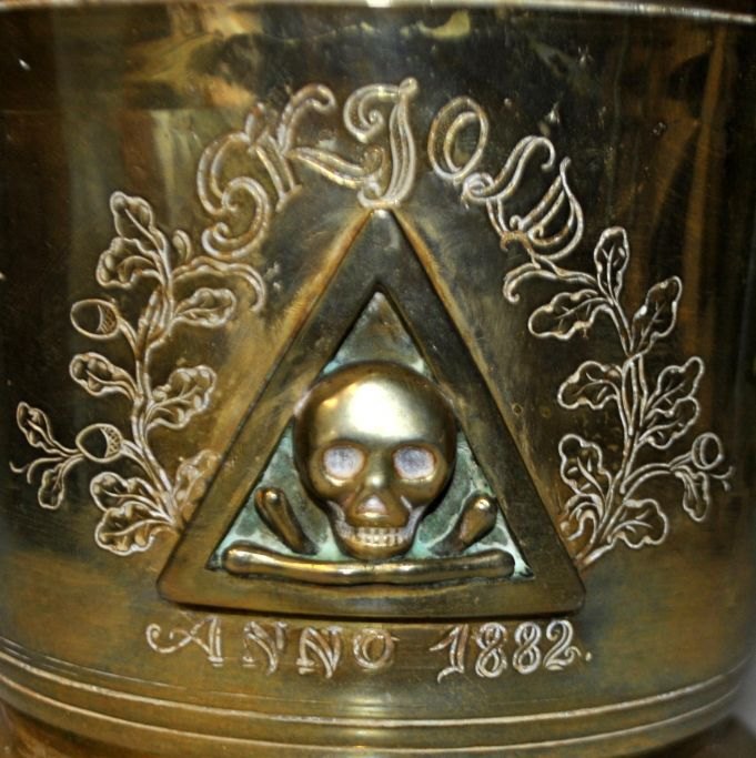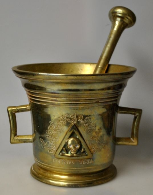 Großer Apothekermörser aus Messing von Svane Apoteket in Randers, 1882. Dänemark. Mit Stößel. Die Seite ist mit einem Dreieck verziert, in dem sich ein Totenkopf mit gekreuzten Knochen befindet. Mit eingraviertem Dekor und dem Namen: Skjold anno. 1882. Höhe: 15 cm. Durchmesser Öffnung: 17 cm. Länge Stößel: 25,5 cm.