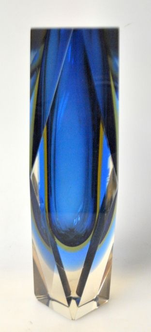 Venezianische Vase - Murano, 1960er Jahre. Italien. Sechseckige Vase. Klares, blaues und gelbes Glas. H.: 20,5 cm.