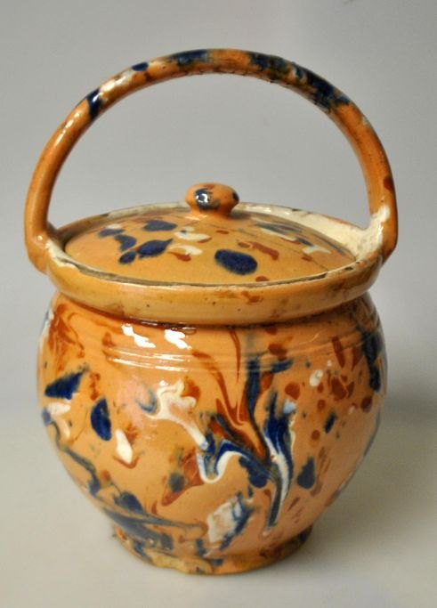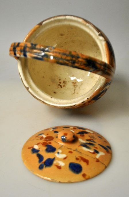 Kleiner dänischer eimer, 19. Jahrhundert. Roter Ton mit Glasur in Blau, Weiß und Rot. Mit Henkel und Deckel. H: 21 cm.