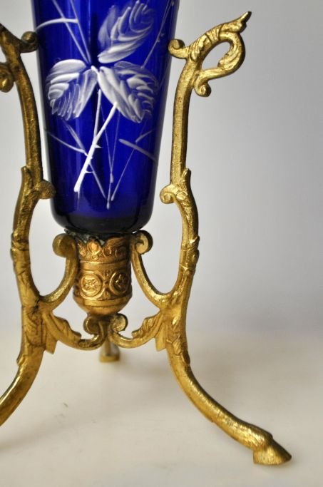 Antike kobaltblaue Vase mit Emailmalerei, Deutschland 19. Jahrhundert. Montiert auf Bronzeständer. H.: 28,5 cm.