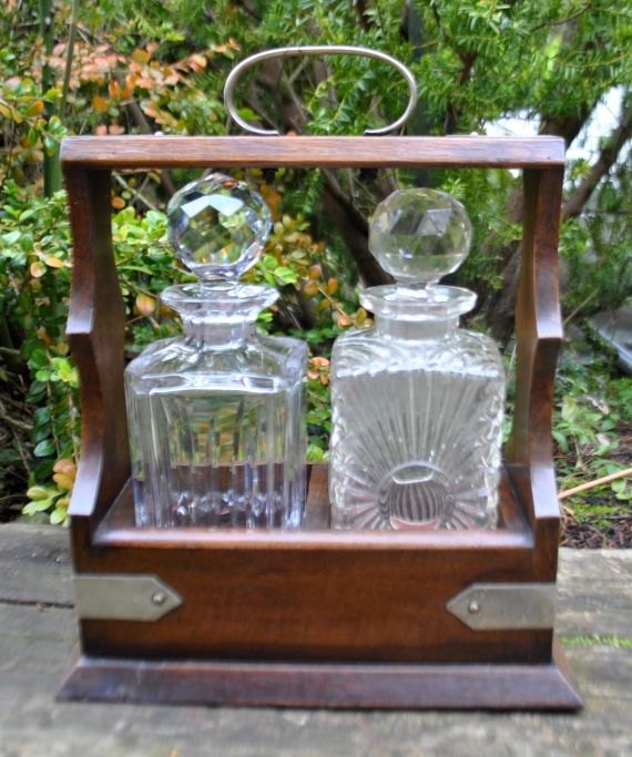 Tantalus aus Eiche mit zwei verschiedenen Kristallkaraffen mit Stöpseln. England. 19. Jahrhundert