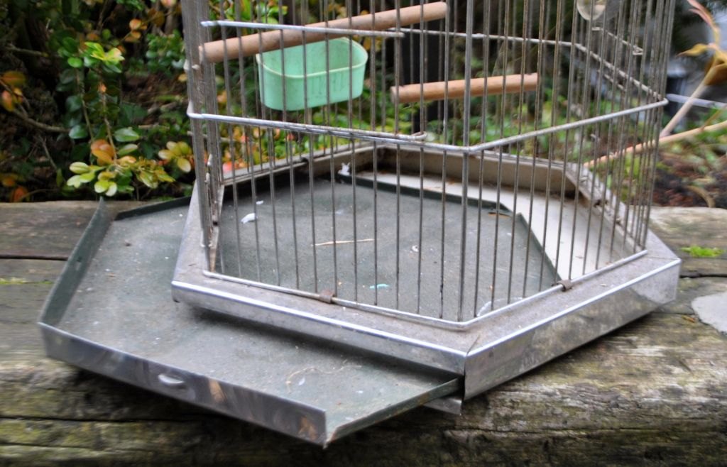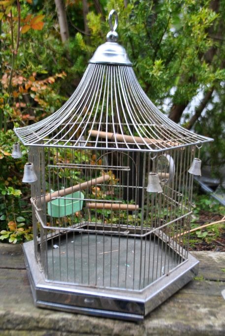 Sechseckiger Vogelkäfig aus Metall, 20. Jahrhundert. Mit einer Tür, zwei Schiebetüren, zwei Holzstiften, Spiegel, Schaukel und Futtertrog. Boden lässt sich zum Reinigen als Schublade herausziehen. Inkl. Haken zum Aufhängen. H: 45 cm. B: 34 cm.