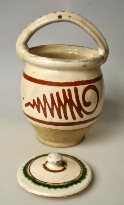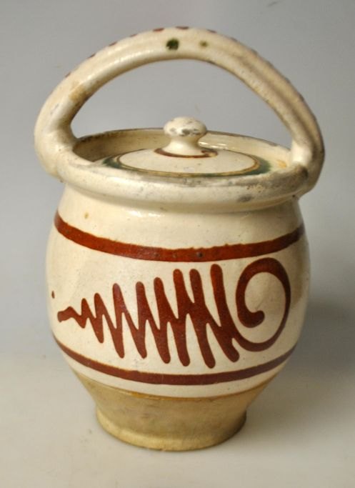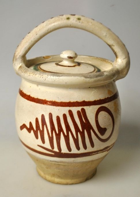Antiker dänischer Mutterschaftstopf aus glasiertem rotem Ton, 19. Jahrhundert. Mit weißer Unterglasur und roten und grünen Überglasuren. H.: 21 cm.
