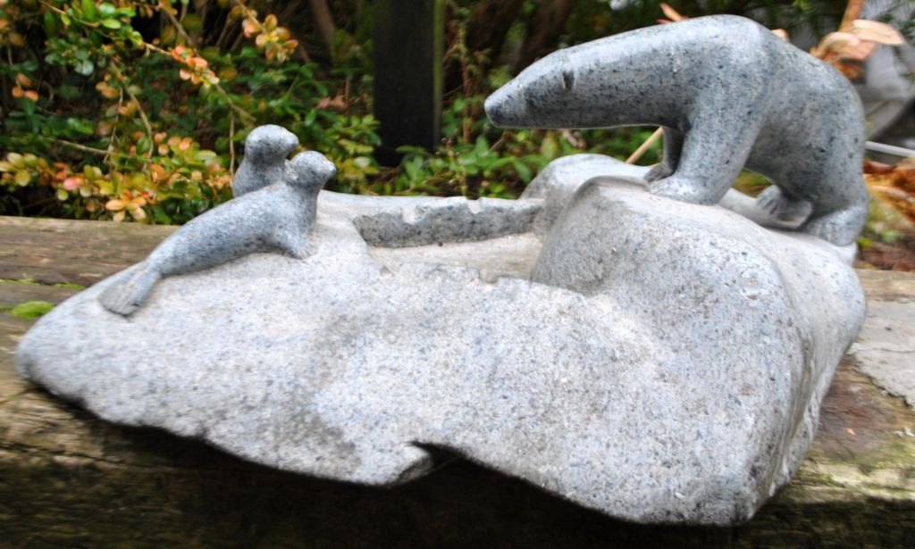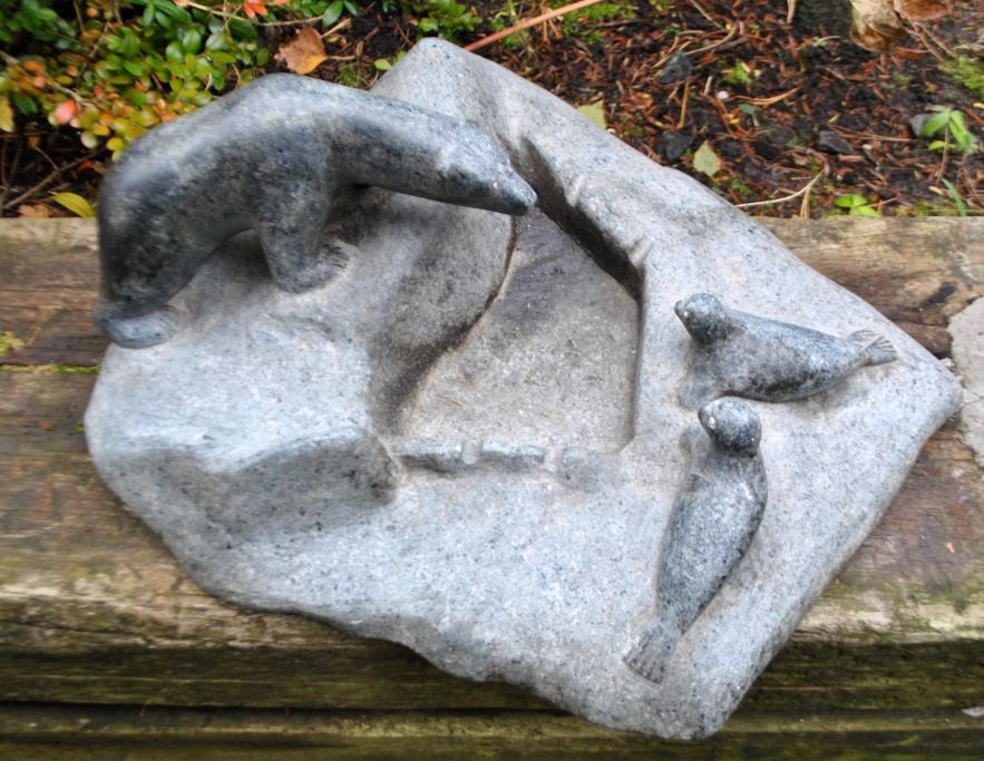 Riesige grönländische Specksteinfigur, 20. Jahrhundert. Ein Eisbär jagt zwei Robben. Unsigniert. L.: 48 cm. B.: 36 cm. H.: 20 cm.