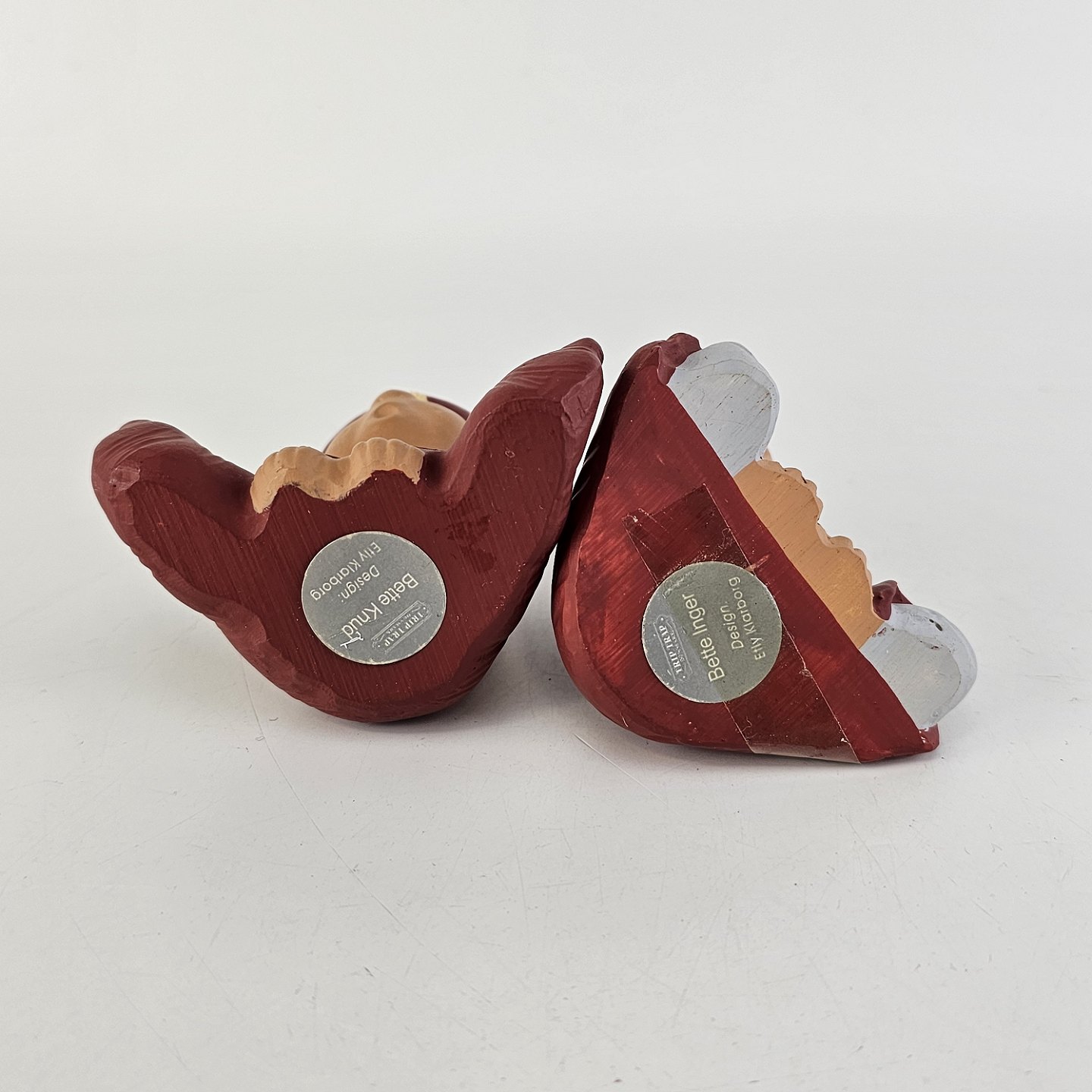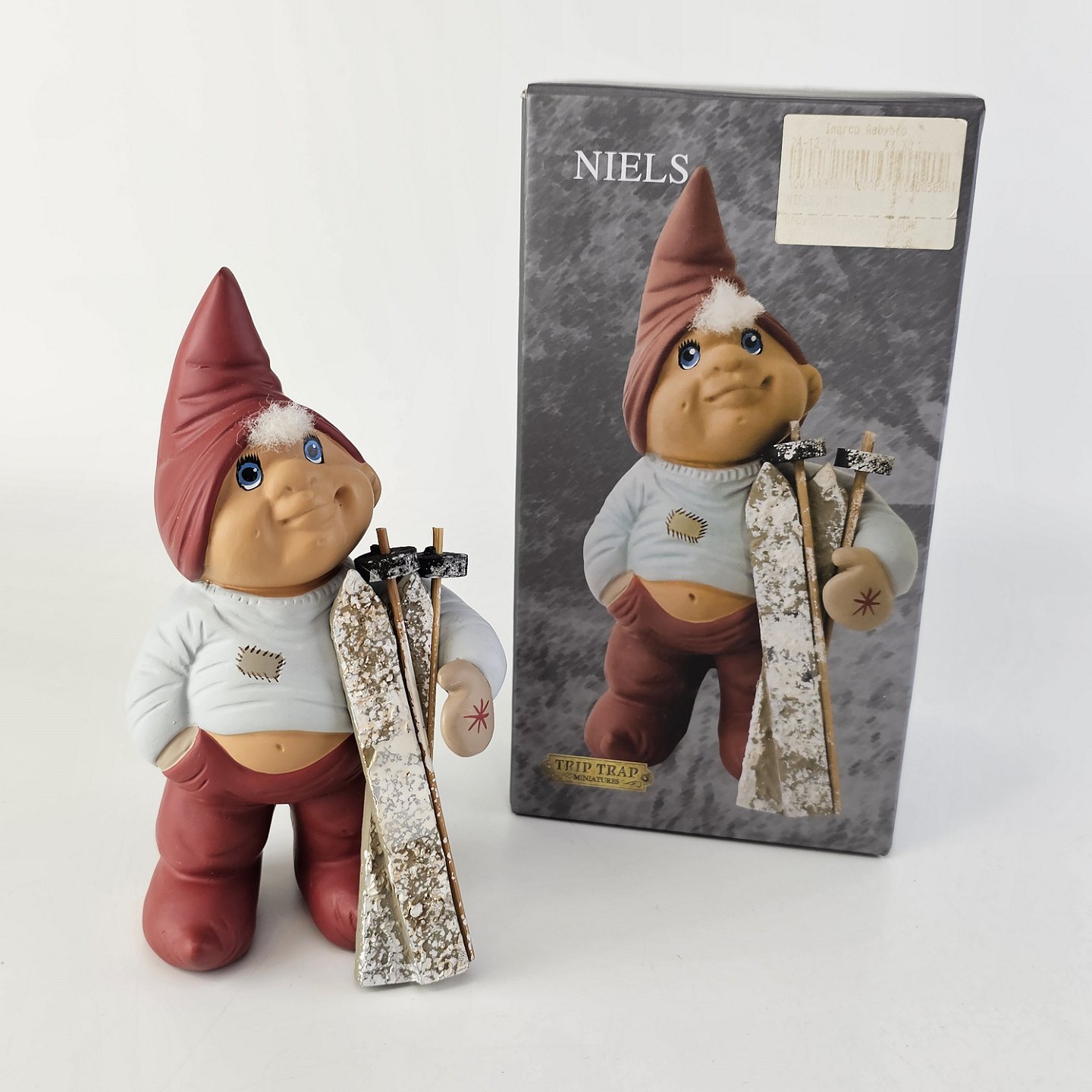 Figurer med motiv af nisserne Bette Inger, Bette Knud og Niels med ski