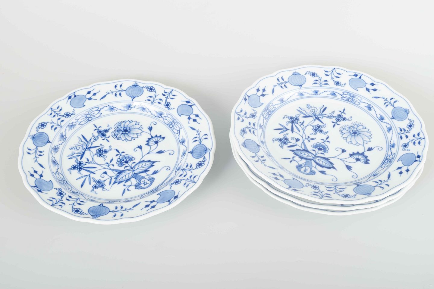 Fire håndmalede porcelænstallerkener i det klassiske “Løgmønstret” (Blue Onion) mønster. Dekoreret i underglasurblå med bølget kant og elegant ornamentik.