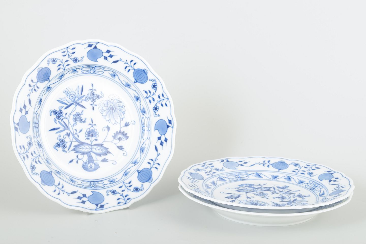 Tre håndmalede porcelænstallerkener i det klassiske “Løgmønstret” (Blue Onion) mønster. Dekoreret i underglasurblå med bølget kant og elegant ornamentik.