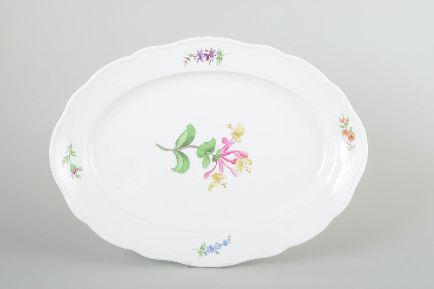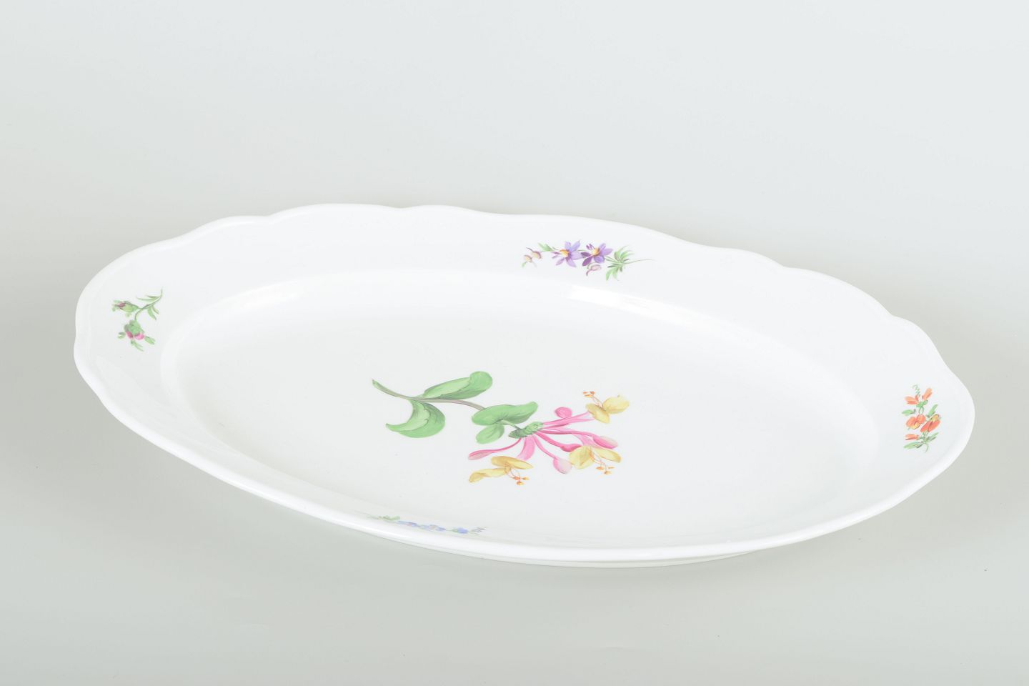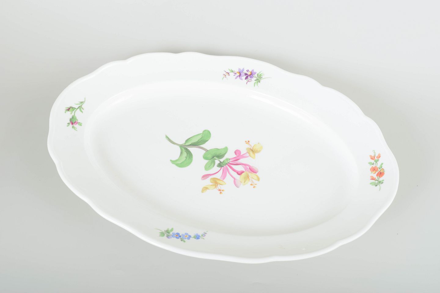 Elegant serveringsfad i porcelæn, håndmalet med blomsterdekorationer i flerfarvet palet. Klassisk bølget kantprofil med relief og fin staffering.