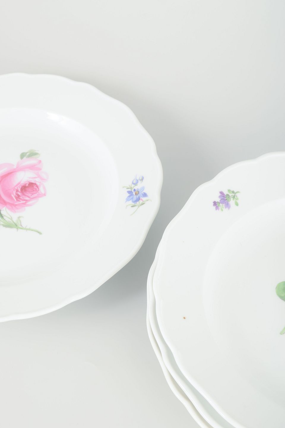 Fire tallerkener i porcelæn, håndmalede med blomsterdekorationer i flerfarvet palet. Klassisk bølget kantprofil med relief og delikat staffering.