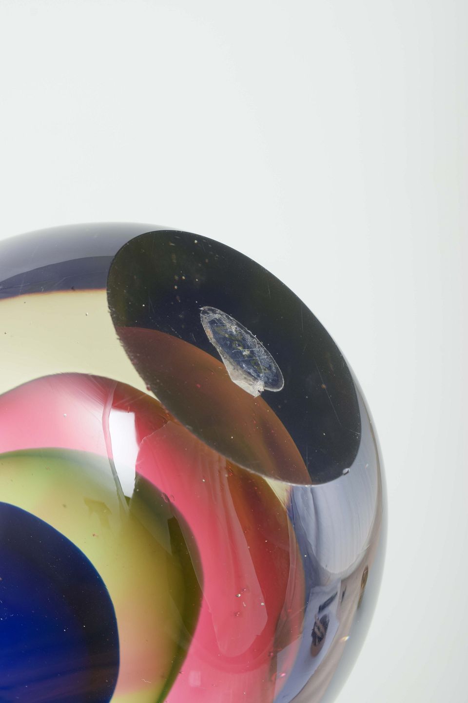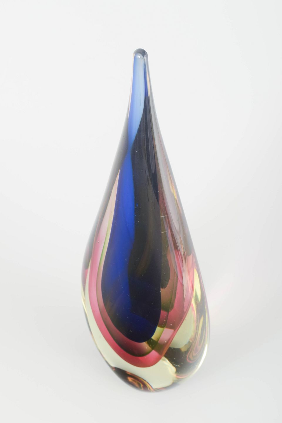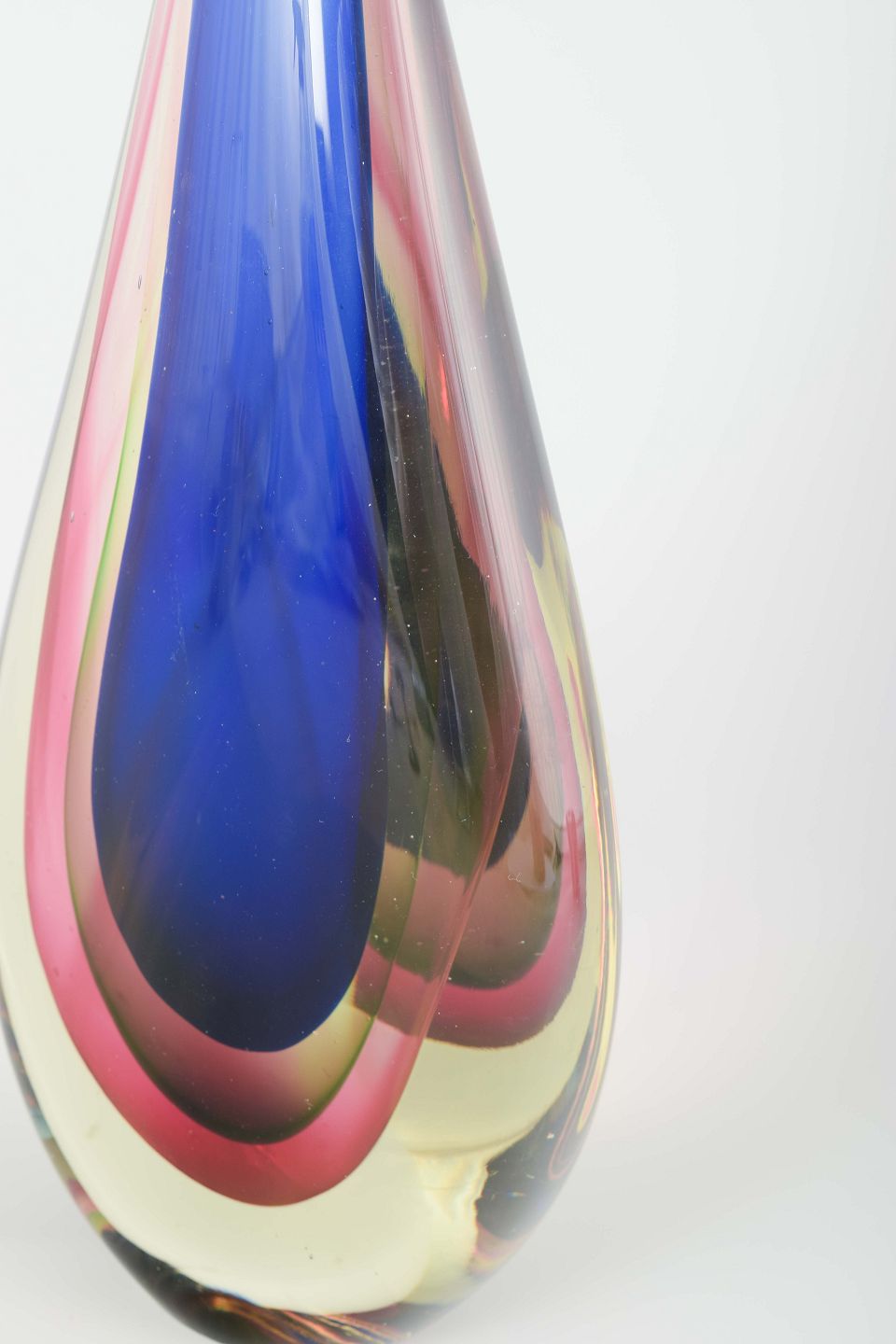 Organisk formet dråbe i massiv glas med lag i blå, rosa, ravfarvede og klare toner. Et klassisk eksempel på italiensk sommerso-teknik, hvor flere lag farvet glas smeltes sammen i et klart yderlag.