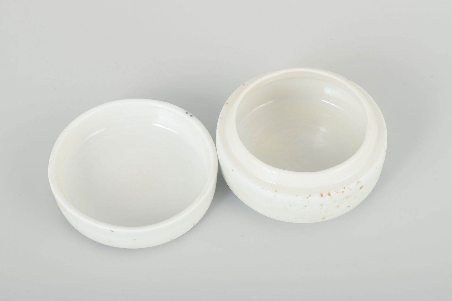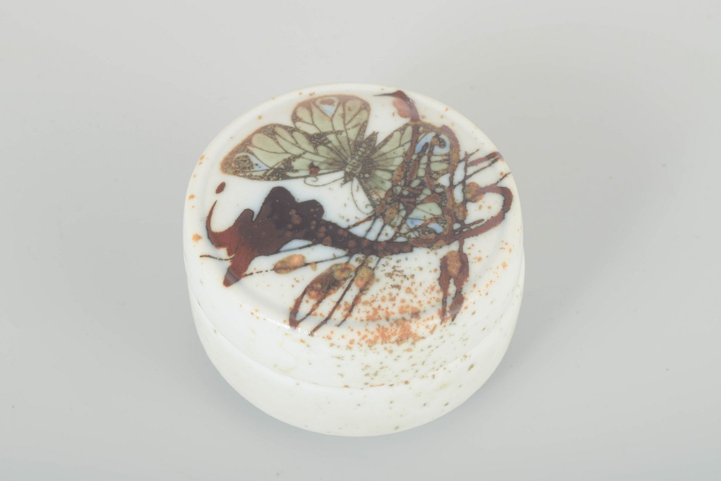 Lille lågkrukke i porcelæn med hvid glasur og dekoration i brunlige og grønne nuancer. Diskret håndmalet motiv på låget og let plettet glasur med varm, naturlig karakter. Et fint eksempel på Royal Copenhagens kunstneriske periode i midten af det 20. århundrede.