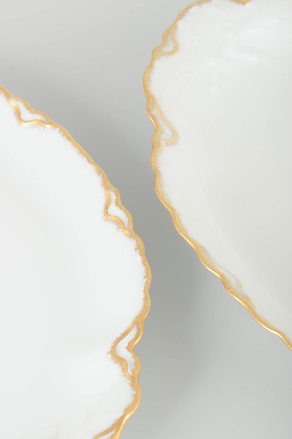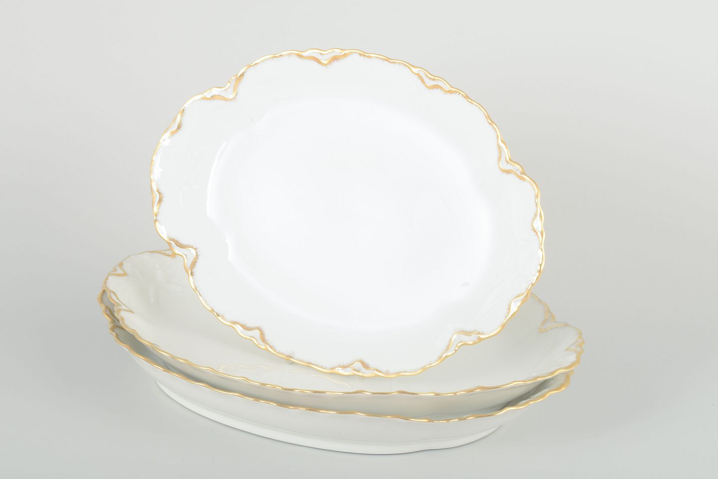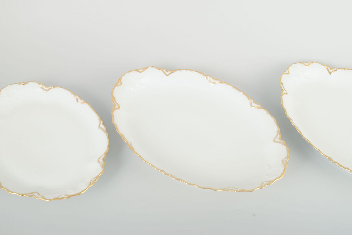 Elegant sæt ovale fade i cremefarvet porcelæn med håndmalet guldkant og svungne profilerede former. Klassisk fransk design i tidstypisk art deco-inspireret udtryk.