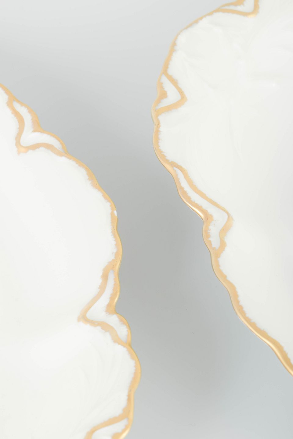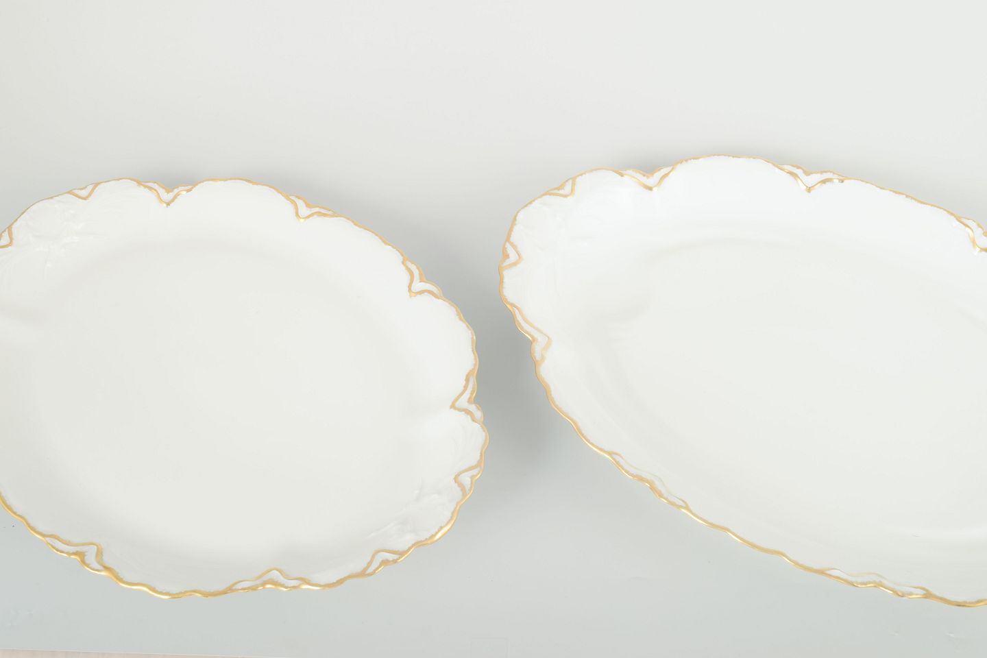 Elegant sæt ovale fade i cremefarvet porcelæn med håndmalet guldkant og svungne profilerede former. Klassisk fransk design i tidstypisk art deco-inspireret udtryk.