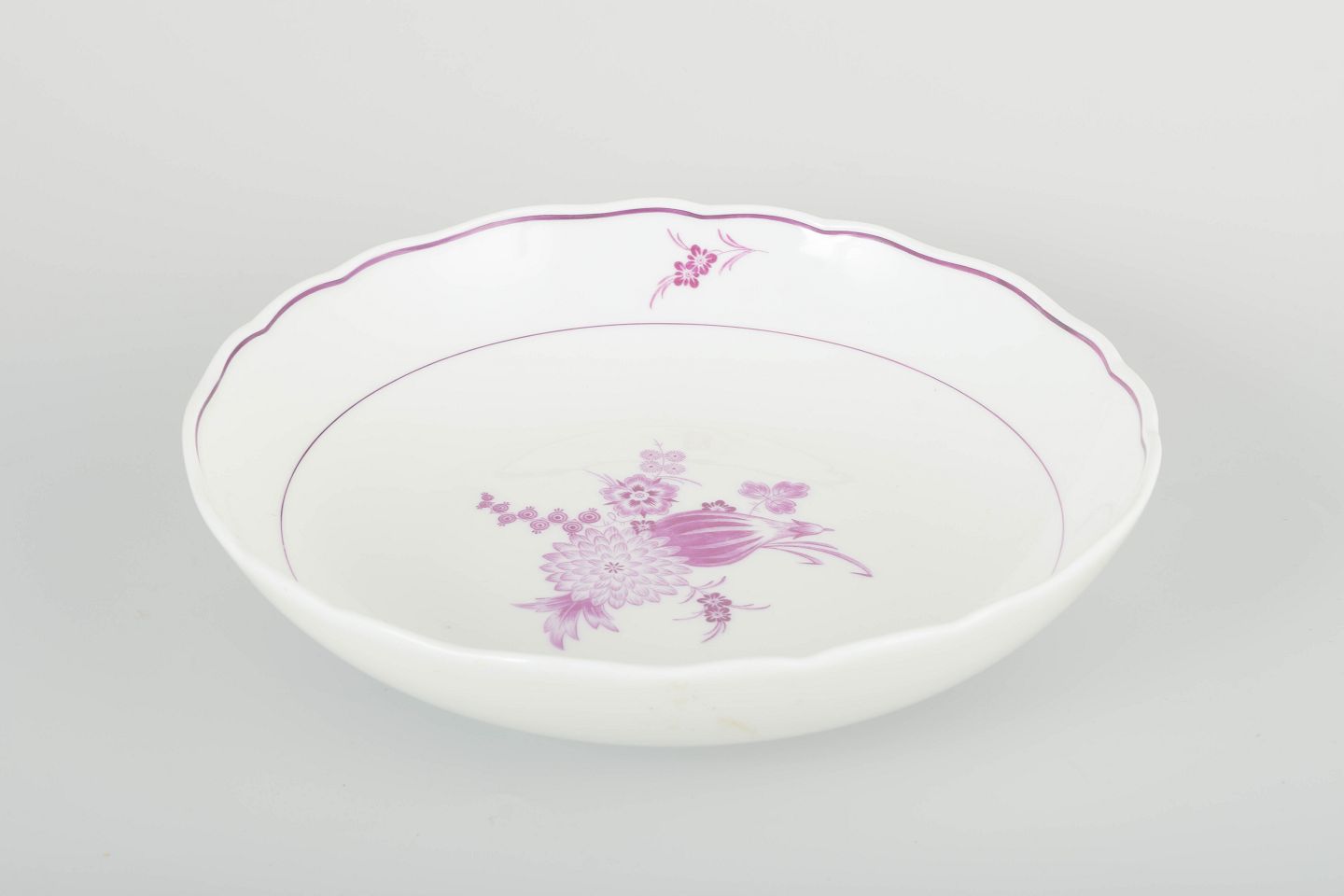 Håndmalet rund skål i porcelæn med dekor i lilla blomsterkompositioner og let bølget kant. Klassisk Meissen-design med elegant staffering i rosa toner.