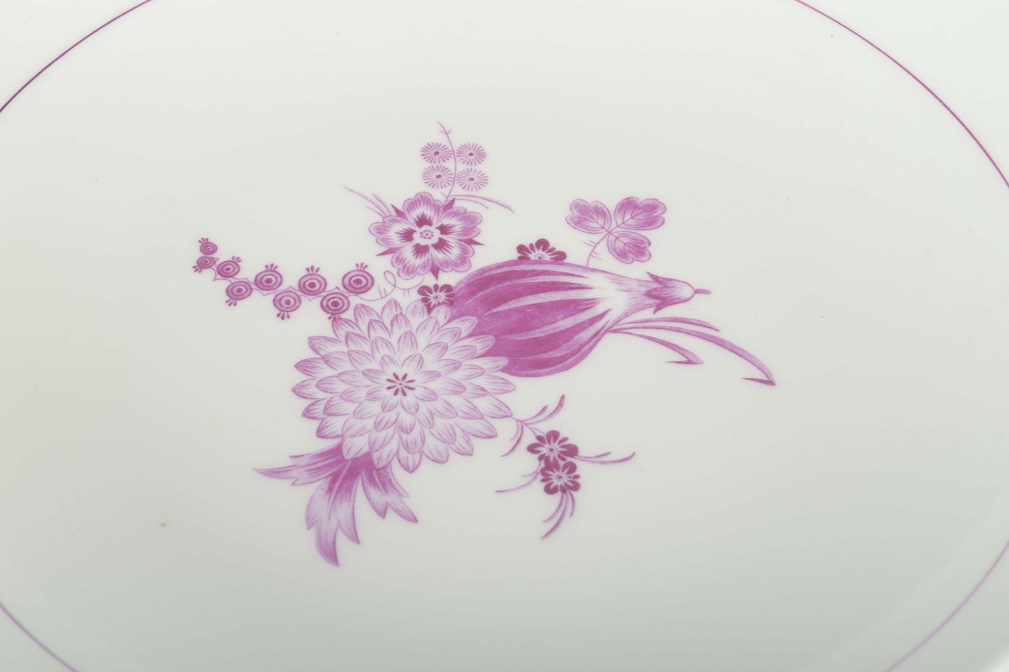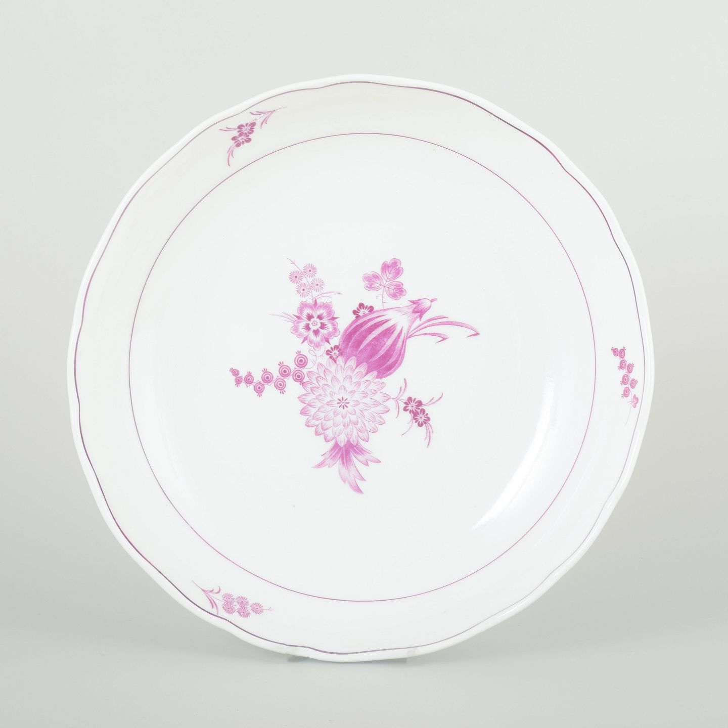 Meissen har siden begyndelsen af 1700-tallet været Europas førende porcelænsfabrik, kendt for sin håndmalede dekoration og tekniske perfektion. I 1930’erne blev de klassiske blomsterdekorer genfortolket i mere afdæmpede farver, som her i lilla, hvilket giver et elegant og tidstypisk udtryk.
