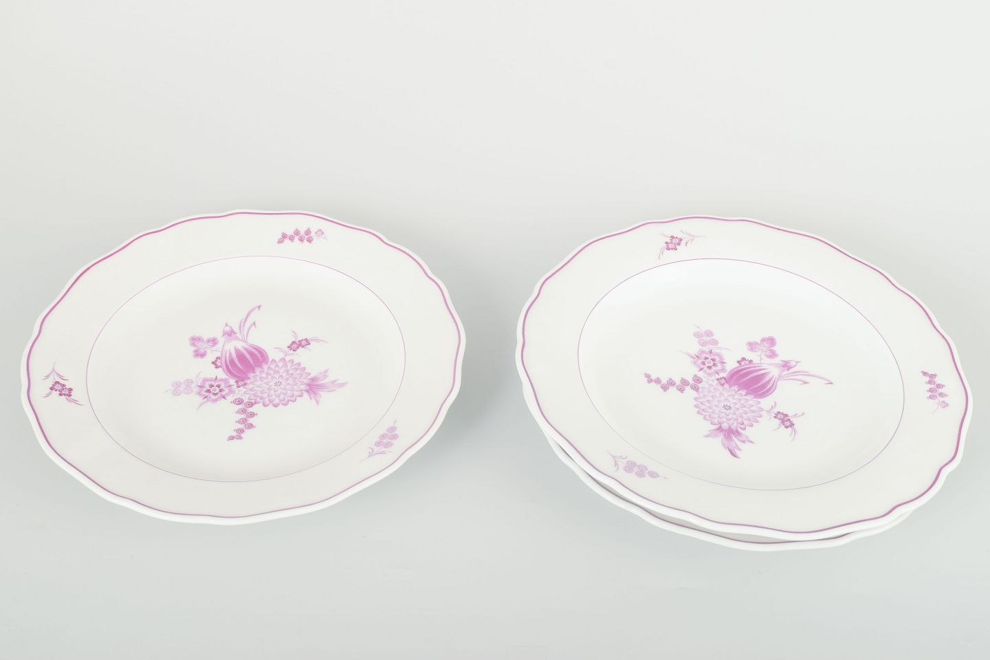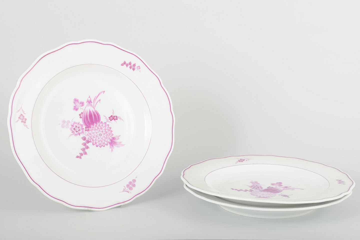 Sæt af tre håndmalede middagstallerkener i porcelæn med dekor i lilla blomsterkompositioner og let bølget kant. Typisk for Meissens klassiske modeller med fin staffering i rosa toner.