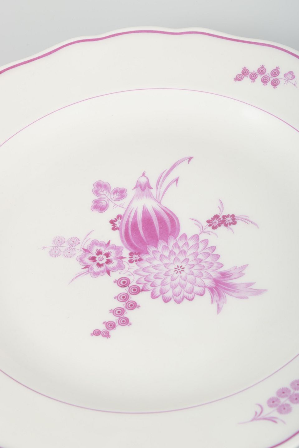 Meissen har siden begyndelsen af 1700-tallet været Europas førende porcelænsfabrik, kendt for sin håndmalede dekoration og tekniske perfektion. I 1930’erne blev de klassiske blomsterdekorer genfortolket i mere afdæmpede farver, som her i lilla, hvilket giver et elegant og tidstypisk udtryk.