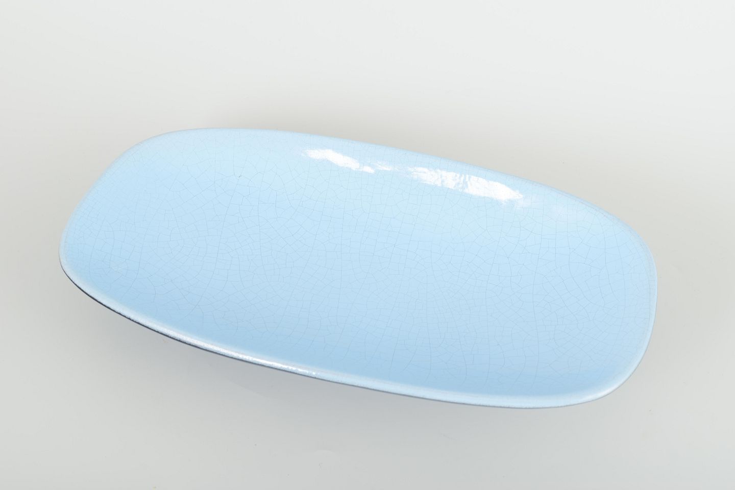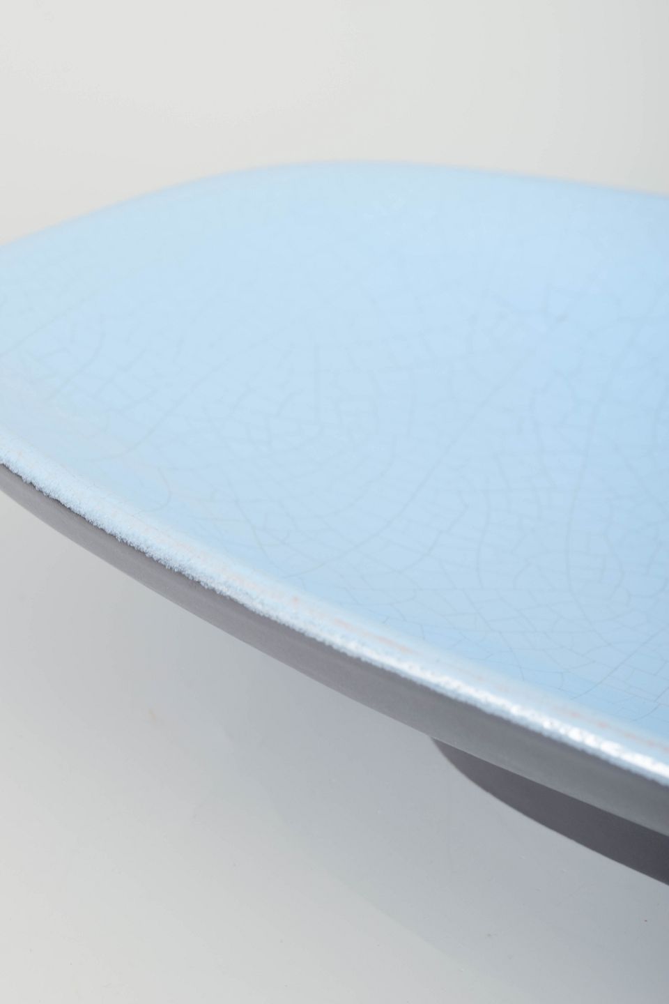Elegant aflangt fad i glaseret keramik med lyseblå krakeléglasur og mørk underside i kontrastfuld, minimalistisk form.