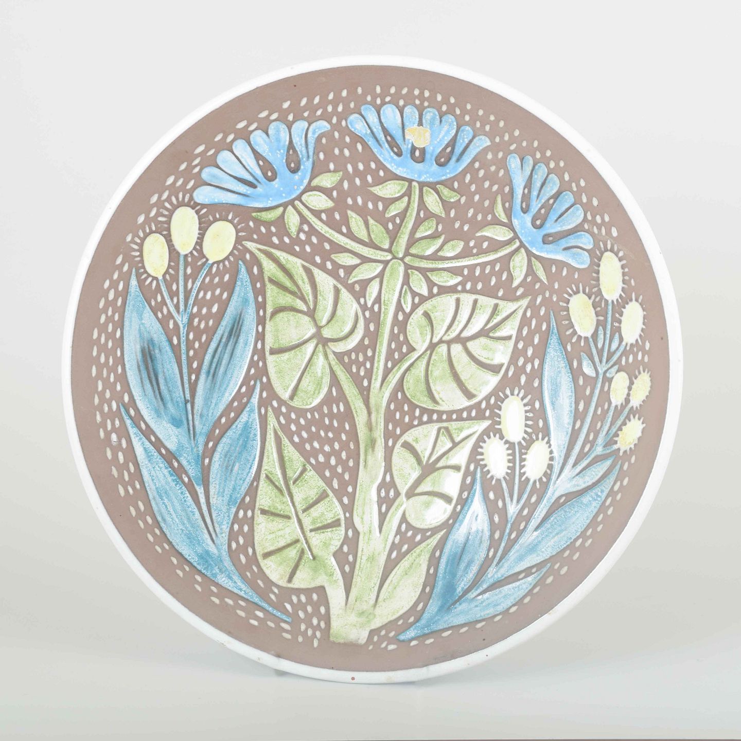 Dekorativt fad i glaseret keramik med reliefmønster af blomster i blå, grønne og hvide nuancer mod brun baggrund.