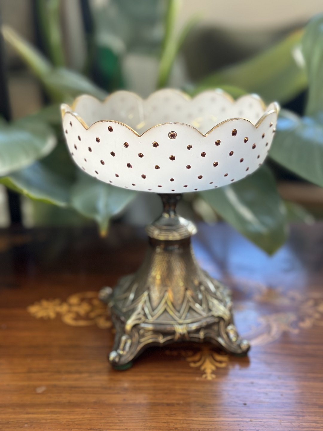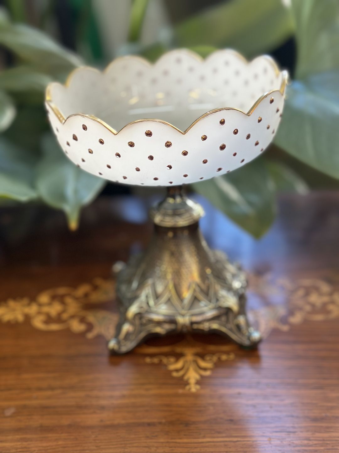 Vintage-Schale aus den 1800er-1900er Jahren, die Schale ist aus Opalglas (milchig weißes Glas) mit handgemalten goldenen Punkten und Goldrand, der Fuß ist versilbert mit dekorativen Jugendstil- und Barock-inspirierten Details, entworfenes Opalglas aus den