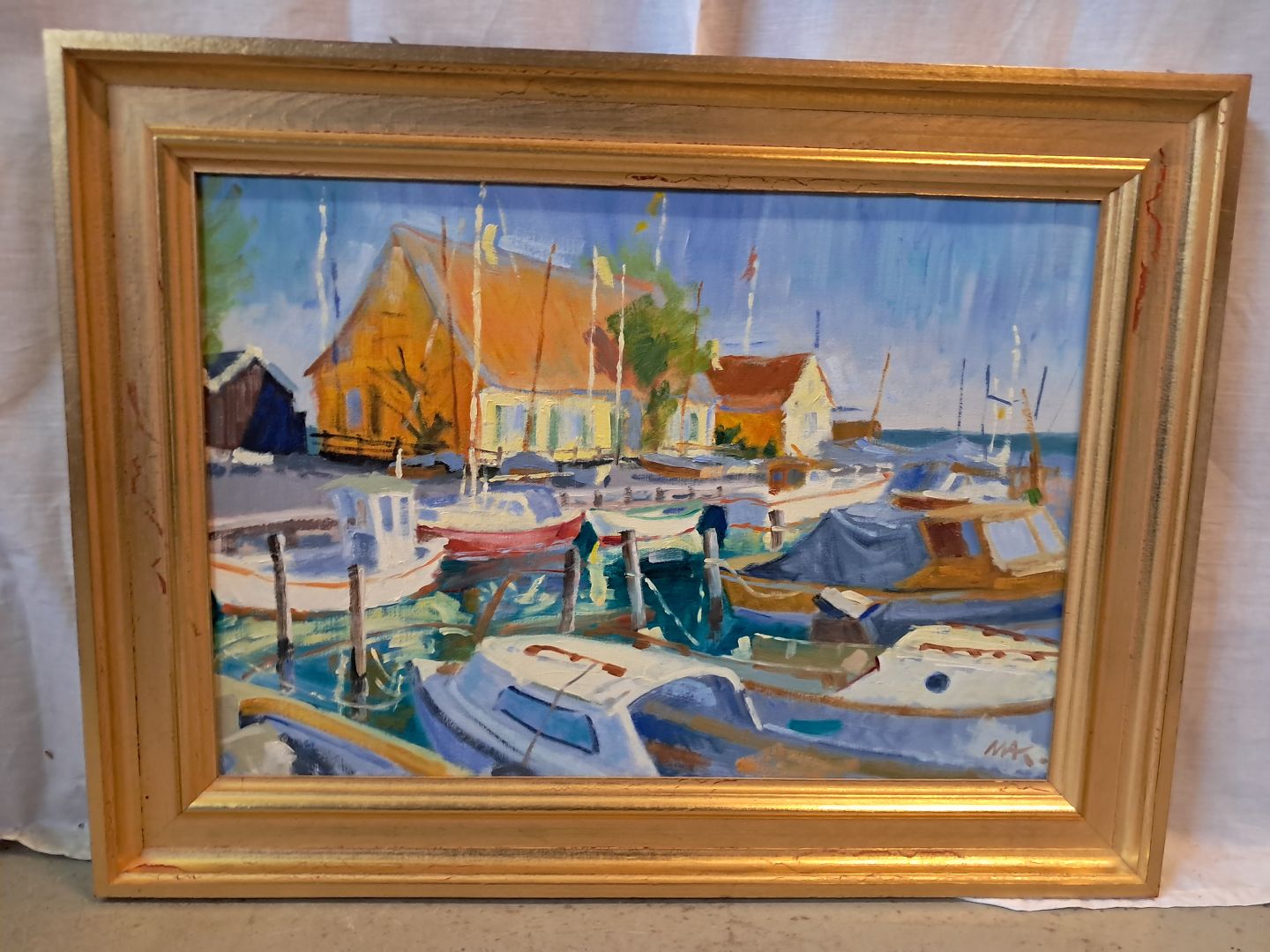 Maleri af Dragør Havn i guldmalet ramme, af : Mogens Amdi Thorsen (1924-2016)
