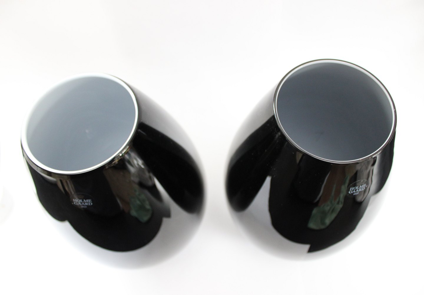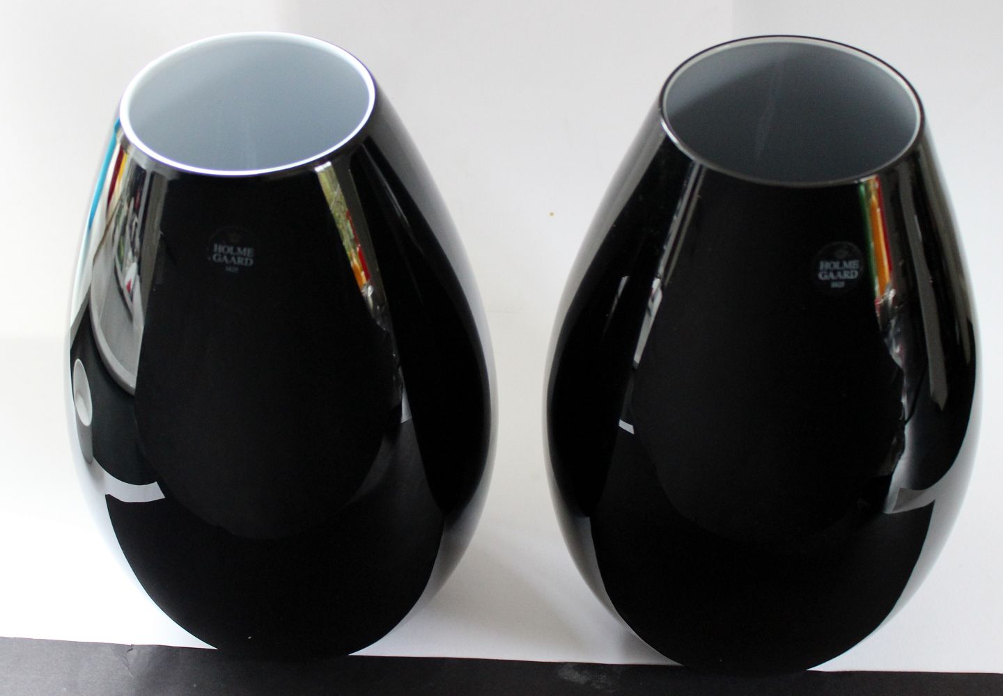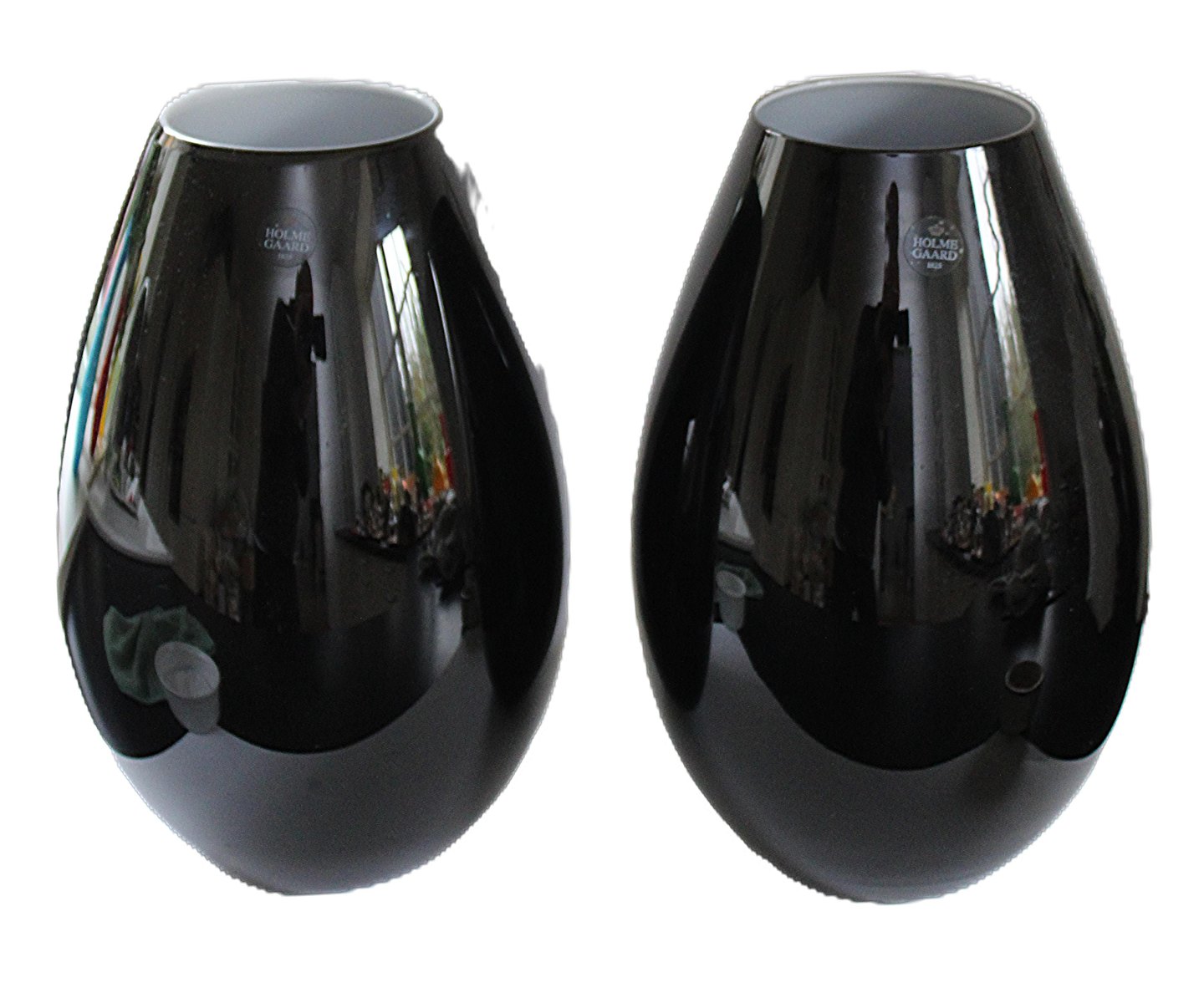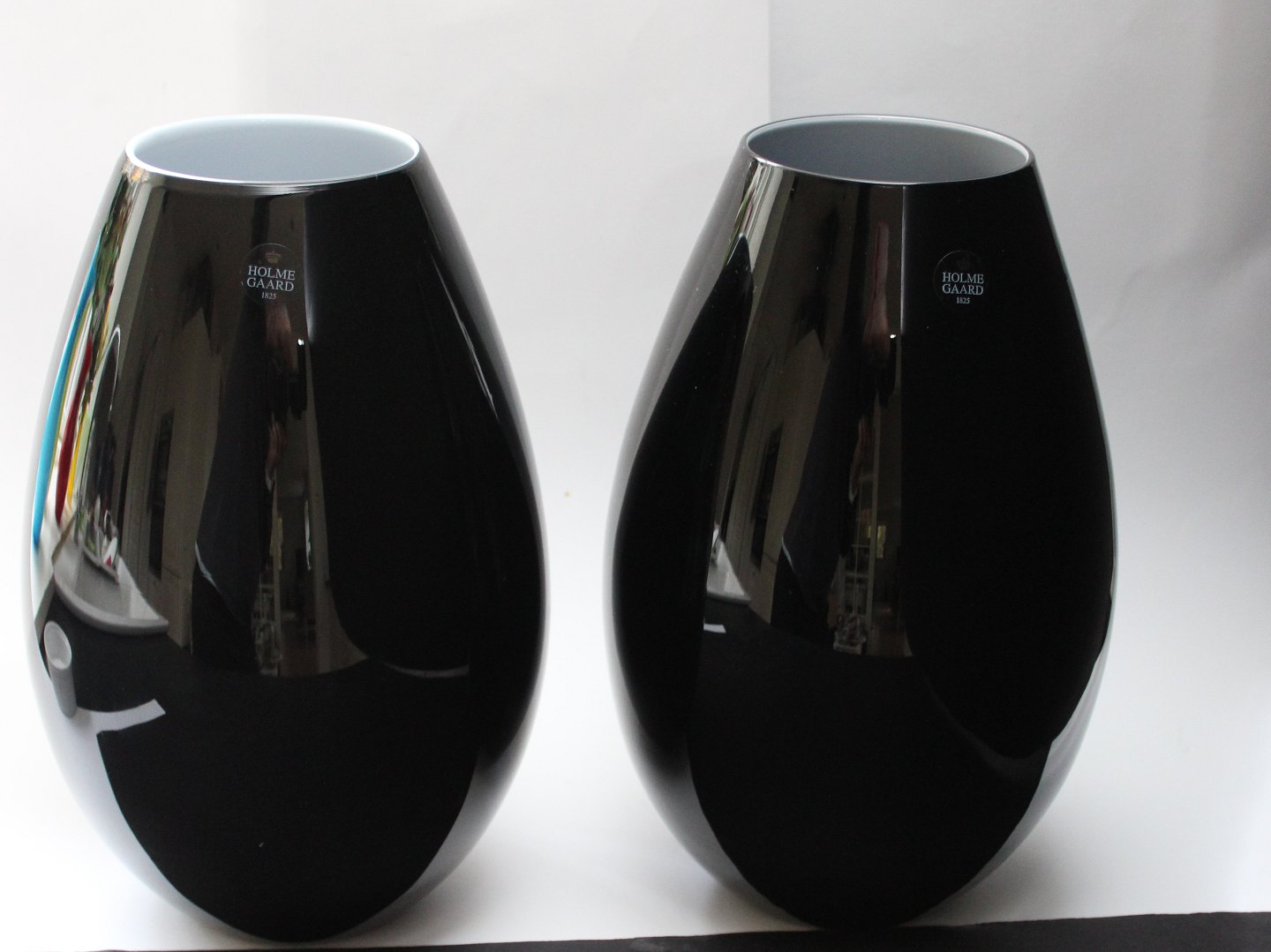 Text zugänglich auf Dänische: Holmegaard, Cocoon stor vase i sort glas udvendig med hvid glas indvendig. Designet af Peter Svarrer i 2005. Største vase. Højde 26 cm. Øverste diameter 9 cm. Trykt signatur og Holmegaard label. Den ene er tungere og mere hvid indvendig, den har også nogle brugsridser udvendig, gør venligst opmærksom på hvilken der ønskes.